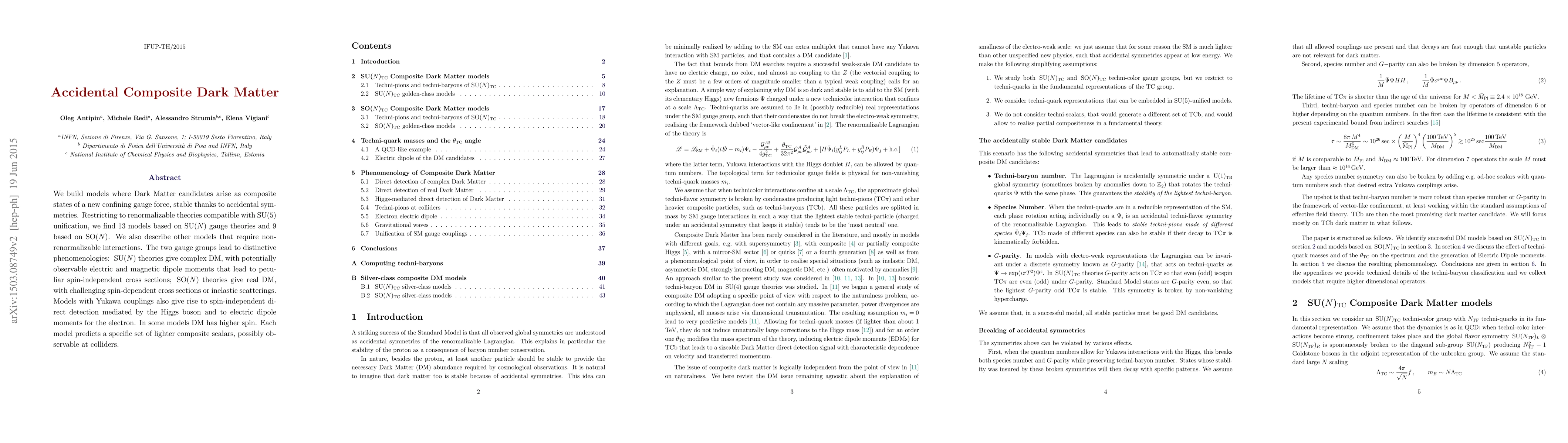 This paper explores composite dark matter models arising from new confining gauge forces stabilized by accidental symmetries, identifying 13 models based on SU(N) and 9 on SO(N) gauge theories. These models predict distinct phenomenologies, including observable electric and magnetic dipole moments for SU(N) and challenging spin-dependent cross sections for SO(N).