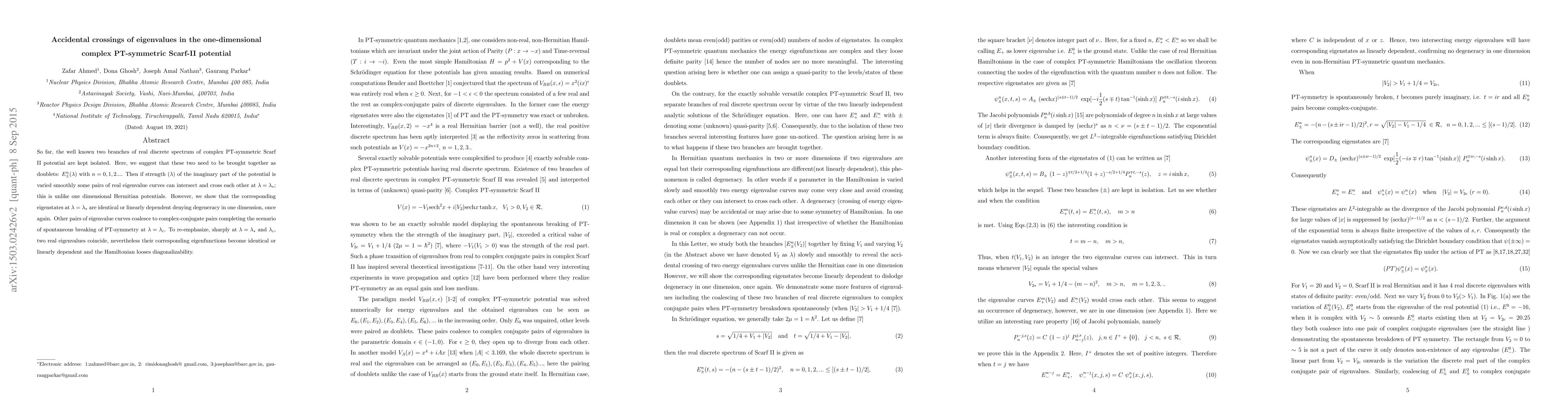 This paper investigates accidental crossings of eigenvalues in the one-dimensional complex PT-symmetric Scarf-II potential, demonstrating that under certain conditions, pairs of real eigenvalues intersect. Despite these crossings, the corresponding eigenstates remain identical or linearly dependent, thus avoiding degeneracy in one dimension.