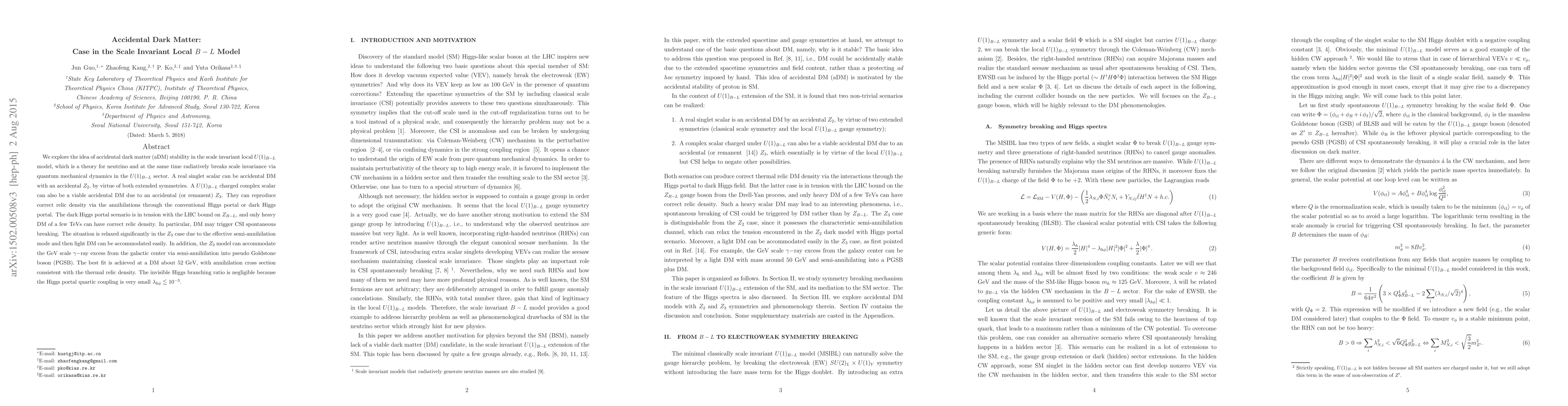 This paper investigates the stability of accidental dark matter (aDM) in scale invariant local $U(1)_{B-L}$ models, proposing that a real singlet scalar or a $U(1)_{B-L}$ charged complex scalar can serve as aDM. The study finds that while the dark Higgs portal scenario is constrained by LHC bounds, the $Z_3$ model can accommodate lighter DM and explain the GeV scale gamma-ray excess from the galactic center.