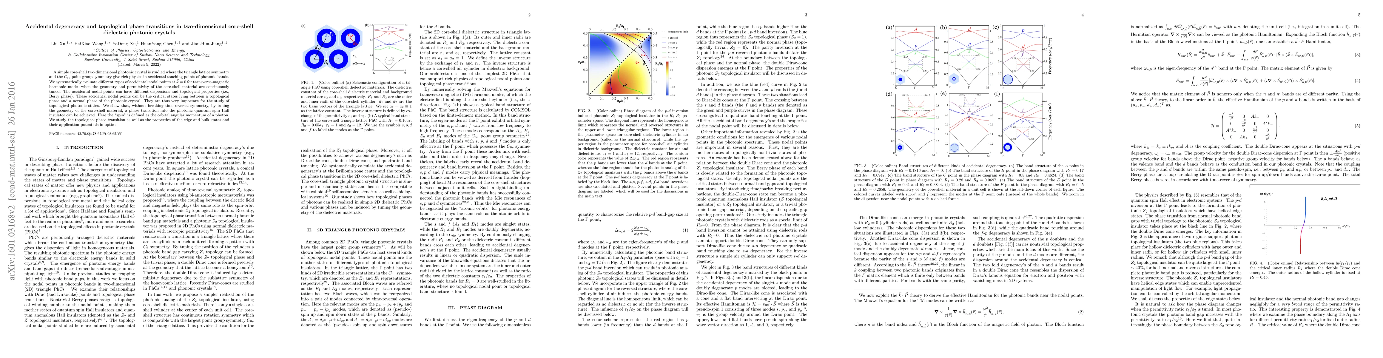 A simple core-shell two-dimensional photonic crystal is studied where the triangle lattice symmetry and $C_{6v}$ rotation symmetry leads to rich physics in the study of accidental degeneracy's in photonic bands. We systematically evaluate different types of accidental nodal points, depending on the dispersions around them and their topological properties, when the geometry and permittivity are continuously changed. These accidental nodal points can be the critical states lying between a topological phase and a normal phase and are thus important for the study of topological photonic states. In time-reversal systems, this leads to the photonic quantum spin Hall insulator where the spin is defined upon the orbital angular momentum for transverse-magnetic polarization. We study the topological phase transition as well as the properties of the edge and bulk states and their application potentials in optics.