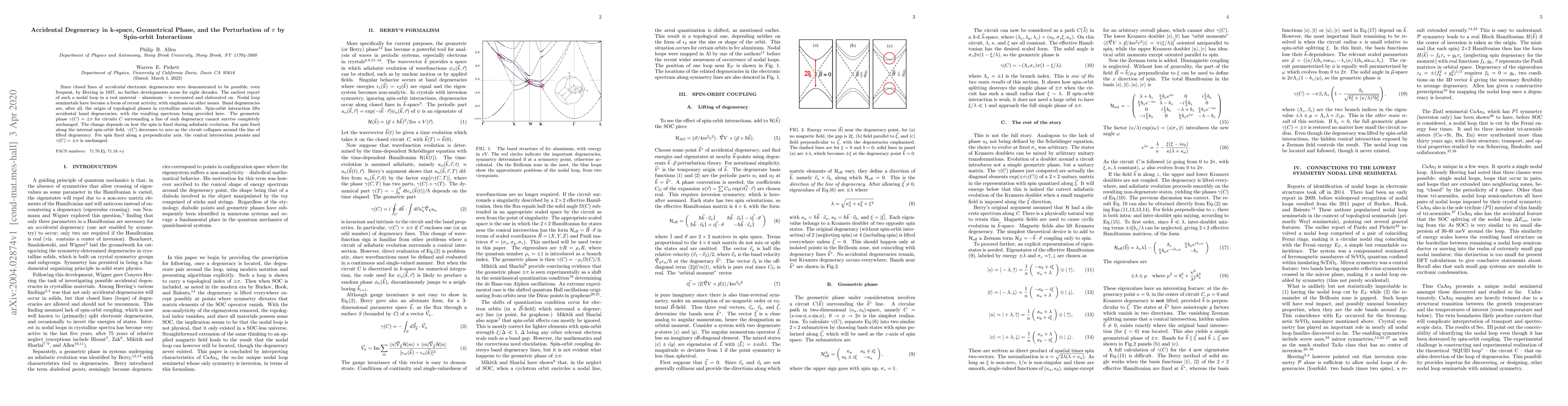 Since closed lines of {\it accidental} electronic degeneracies were demonstrated to be possible, even frequent, by Herring in 1937, no further developments arose for eight decades. The earliest report of such a nodal loop in a real material -- aluminum -- is recounted and elaborated on. Nodal loop semimetals have become a focus of recent activity, with emphasis on other issues. Band degeneracies are, after all, the origin of topological phases in crystalline materials. Spin-orbit interaction lifts accidental band degeneracies, with the resulting spectrum being provided here. The geometric phase $\gamma(C)=\pm\pi$ for circuits $C$ surrounding a line of such degeneracy cannot survive completely unchanged. The change depends on how the spin is fixed during adiabatic evolution. For spin fixed along the internal spin-orbit field, $\gamma(C)$ decreases to zero as the circuit collapses around the line of lifted degeneracy. For spin fixed along a perpendicular axis, the conical intersection persists and $\gamma(C)=\pm\pi$ is unchanged.