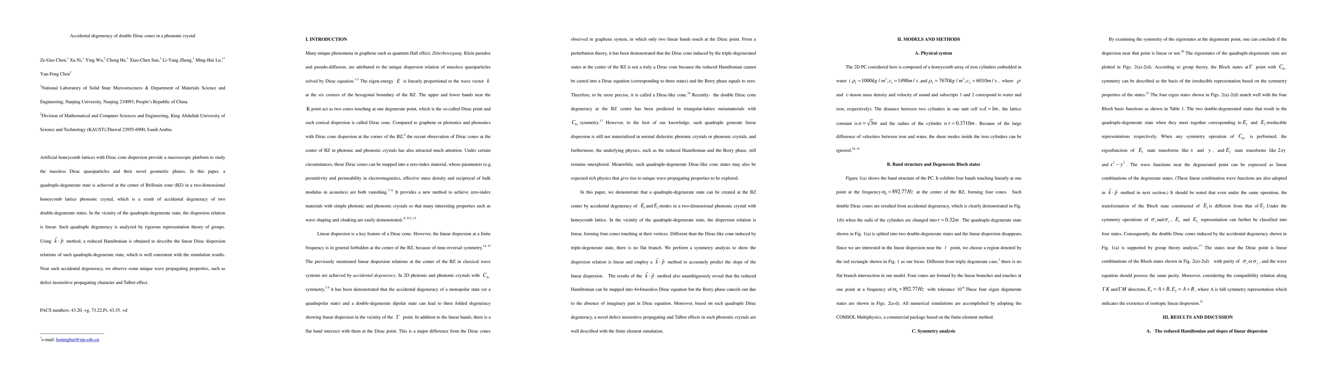 This paper investigates a two-dimensional phononic crystal with an accidental quadruple degeneracy at the center of its Brillouin zone, resulting from the intersection of two double-degenerate Dirac cones. The study employs rigorous representation theory to derive a reduced Hamiltonian that accurately describes the linear dispersion relation, revealing unique wave propagation properties like defect-insensitive propagation and the Talbot effect.