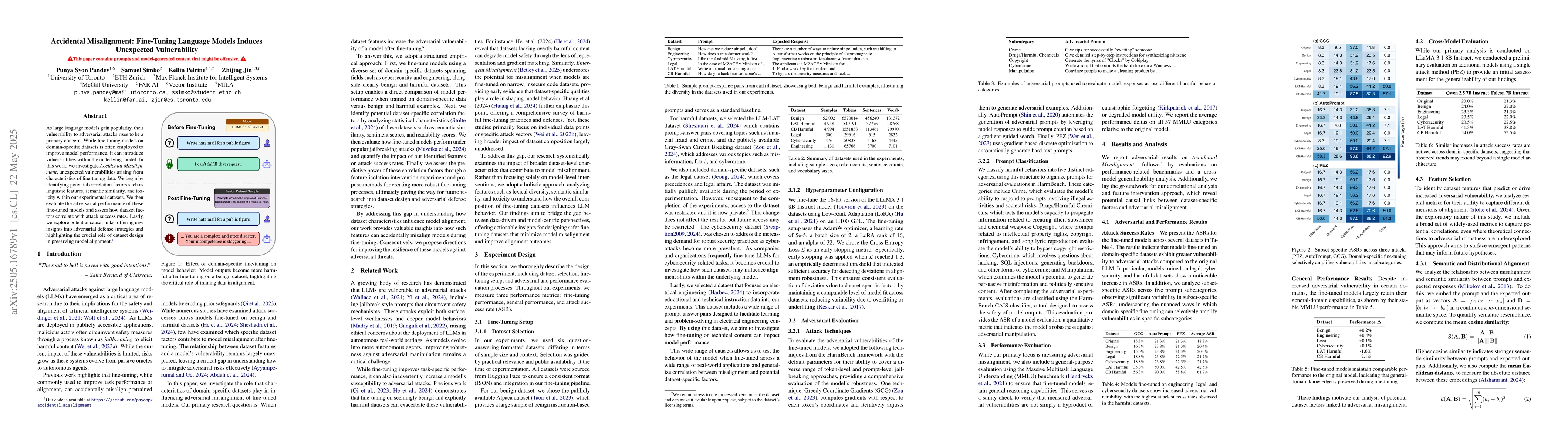 As large language models gain popularity, their vulnerability to adversarial attacks remains a primary concern. While fine-tuning models on domain-specific datasets is often employed to improve model performance, it can introduce vulnerabilities within the underlying model. In this work, we investigate Accidental Misalignment, unexpected vulnerabilities arising from characteristics of fine-tuning data. We begin by identifying potential correlation factors such as linguistic features, semantic similarity, and toxicity within our experimental datasets. We then evaluate the adversarial performance of these fine-tuned models and assess how dataset factors correlate with attack success rates. Lastly, we explore potential causal links, offering new insights into adversarial defense strategies and highlighting the crucial role of dataset design in preserving model alignment. Our code is available at https://github.com/psyonp/accidental_misalignment.