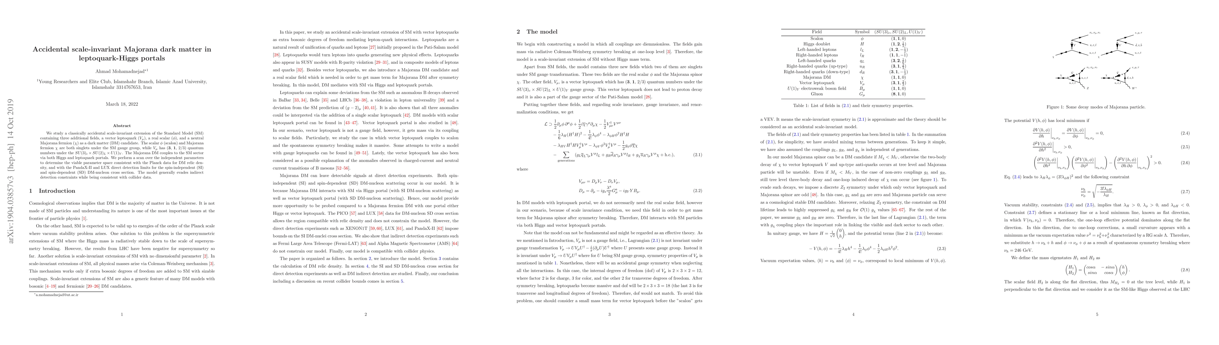 We study a classically accidental scale-invariant extension of the Standard Model (SM) containing three additional fields, a vector leptoquark ($ V_{\mu} $), a real scalar ($ \phi $), and a neutral Majorana fermion ($ \chi $) as a dark matter (DM) candidate. The scalar $ \phi $ (scalon) and Majorana fermion $ \chi $ are both singlets under the SM gauge group, while $ V_{\mu} $ has (\textbf{3}, \textbf{1}, 2/3) quantum numbers under the $ SU(3)_{c} \times SU(2)_{L} \times U(1)_{Y} $. The Majorana DM couples to the SM sector via both Higgs and leptoquark portals. We perform a scan over the independent parameters to determine the viable parameter space consistent with the Planck data for DM relic density, and with the PandaX-II and LUX direct detection limits for the spin-independent (SI) and spin-dependent (SD) DM-nucleon cross section. The model generally evades indirect detection constraints while being consistent with collider data.