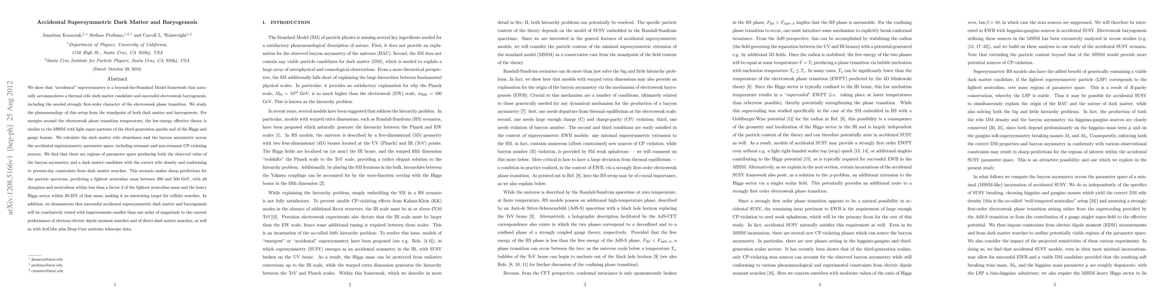 This paper proposes an "accidental" supersymmetry framework that naturally explains both dark matter and electroweak baryogenesis. It predicts a particle spectrum with a lightest neutralino mass between 200 and 500 GeV, and suggests that improvements in experimental searches could confirm this scenario.
