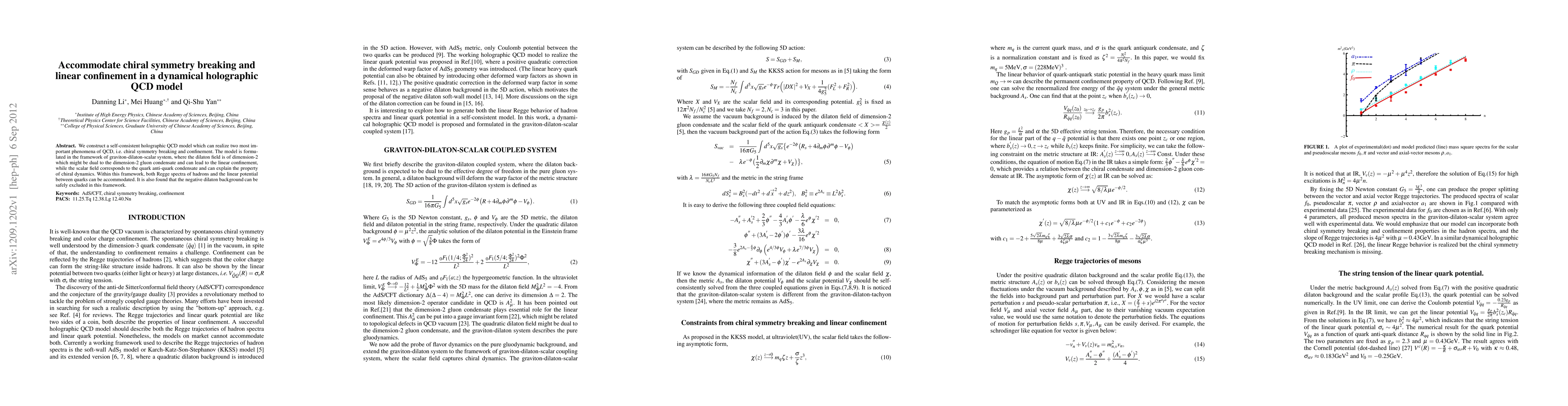 This paper constructs a holographic QCD model incorporating chiral symmetry breaking and linear confinement using a graviton-dilaton-scalar system. The dilaton field, dual to the gluon condensate, facilitates linear confinement, while the scalar field represents the quark anti-quark condensate, explaining chiral dynamics and matching Regge spectra and linear potentials.