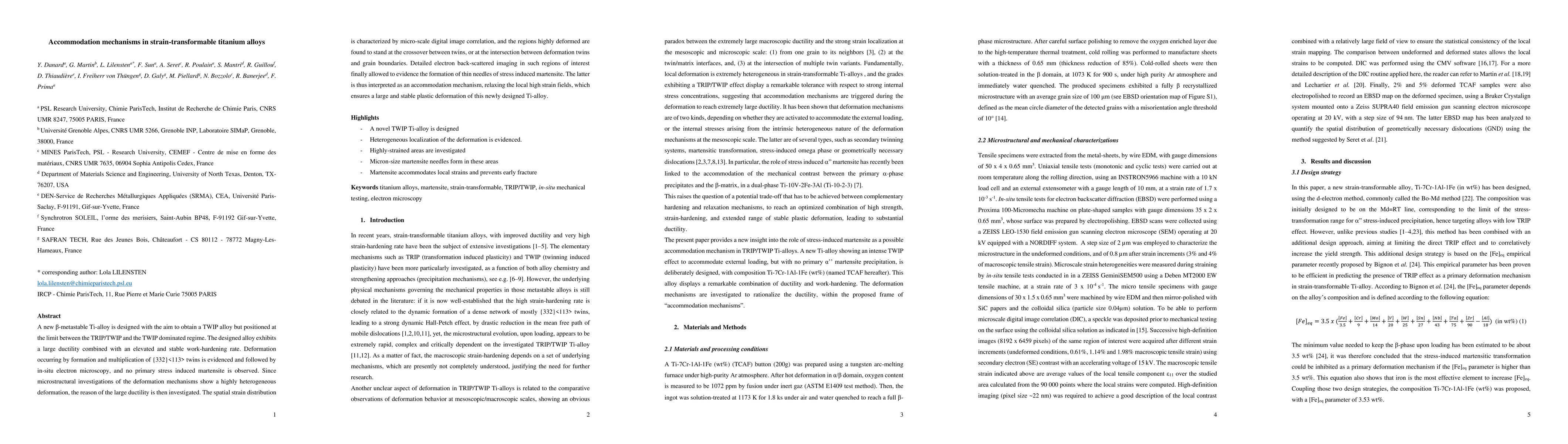 A new $\beta$-metastable Ti-alloy is designed with the aim to obtain a TWIP alloy but positioned at the limit between the TRIP/TWIP and the TWIP dominated regime. The designed alloy exhibits a large ductility combined with an elevated and stable work-hardening rate. Deformation occurring by formation and multiplication of {332}<113> twins is evidenced and followed by in-situ electron microscopy, and no primary stress induced martensite is observed. Since microstructural investigations of the deformation mechanisms show a highly heterogeneous deformation, the reason of the large ductility is then investigated. The spatial strain distribution is characterized by micro-scale digital image correlation, and the regions highly deformed are found to stand at the crossover between twins, or at the intersection between deformation twins and grain boundaries. Detailed electron back-scattered imaging in such regions of interest finally allowed to evidence the formation of thin needles of stress induced martensite. The latter is thus interpreted as an accommodation mechanism, relaxing the local high strain fields, which ensures a large and stable plastic deformation of this newly designed Ti-alloy.