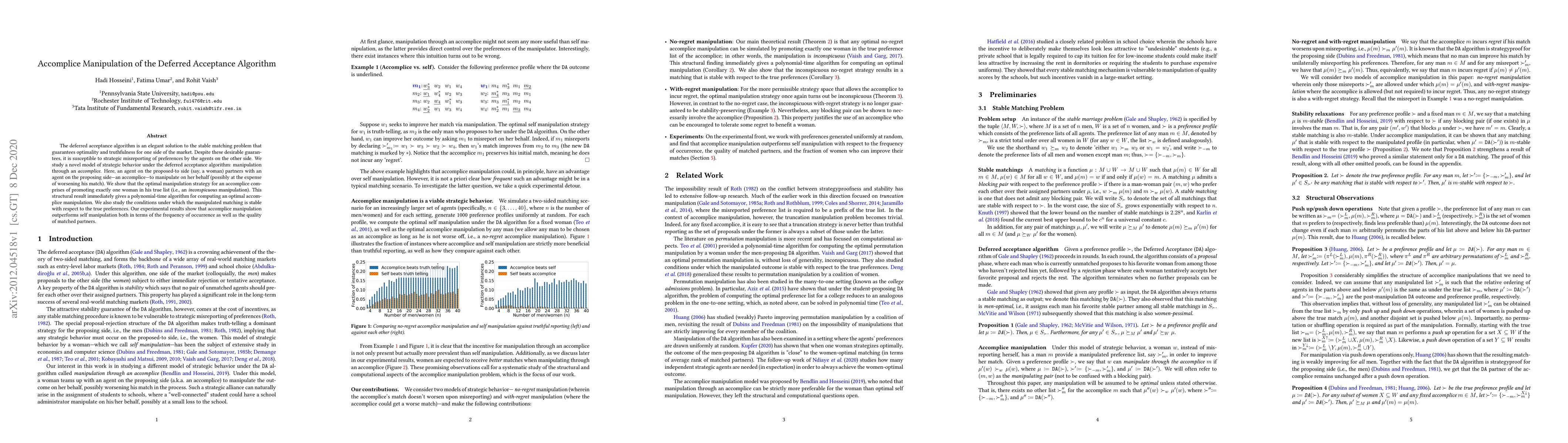 This paper investigates strategic manipulation in the deferred acceptance algorithm through accomplice partnerships, demonstrating that optimal manipulation involves promoting exactly one woman in the accomplice's preference list. The study provides a polynomial-time algorithm for optimal manipulation and shows that accomplice manipulation is more frequent and effective than self-manipulation.
