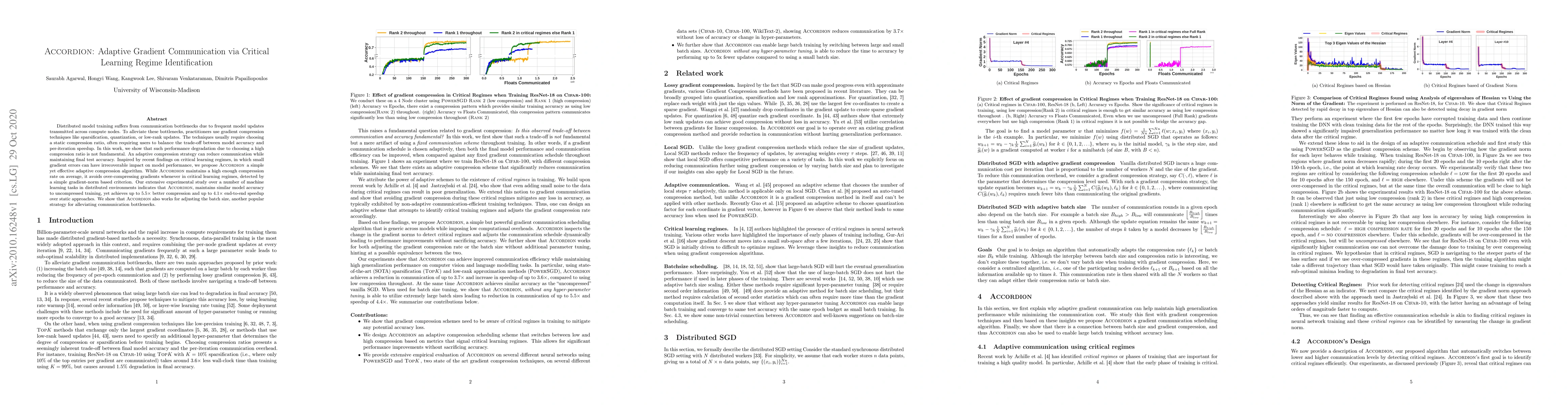 Accordion reduces communication bottlenecks in distributed model training by adapting compression ratios based on critical learning regimes, achieving similar accuracy to uncompressed training while improving up to 5.5x compression and 4.1x speedup.