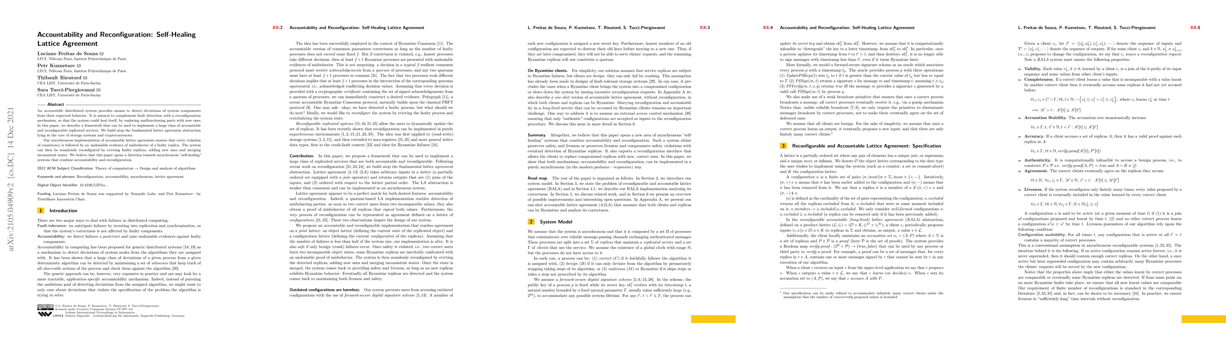 An accountable distributed system provides means to detect deviations of system components from their expected behavior. It is natural to complement fault detection with a reconfiguration mechanism, so that the system could heal itself, by replacing malfunctioning parts with new ones. In this paper, we describe a framework that can be used to implement a large class of accountable and reconfigurable replicated services. We build atop the fundamental lattice agreement abstraction lying at the core of storage systems and cryptocurrencies. Our asynchronous implementation of accountable lattice agreement ensures that every violation of consistency is followed by an undeniable evidence of misbehavior of a faulty replica. The system can then be seamlessly reconfigured by evicting faulty replicas, adding new ones and merging inconsistent states. We believe that this paper opens a direction towards asynchronous "self-healing" systems that combine accountability and reconfiguration.
