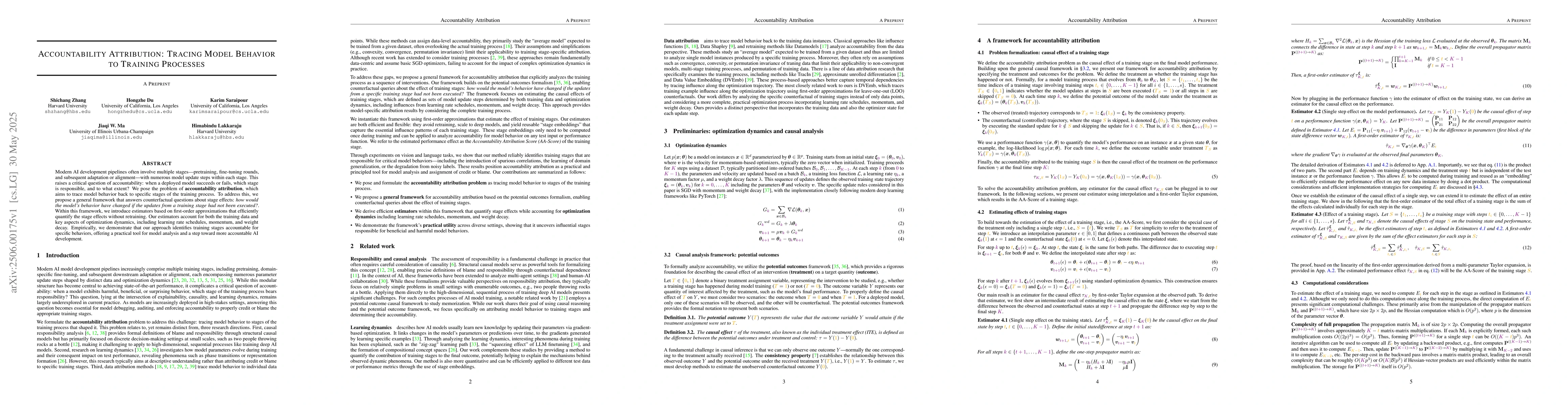 Modern AI development pipelines often involve multiple stages-pretraining, fine-tuning rounds, and subsequent adaptation or alignment-with numerous model update steps within each stage. This raises a critical question of accountability: when a deployed model succeeds or fails, which stage is responsible, and to what extent? We pose the problem of accountability attribution, which aims to trace model behavior back to specific stages of the training process. To address this, we propose a general framework that answers counterfactual questions about stage effects: how would the model behavior have changed if the updates from a training stage had not been executed?. Within this framework, we introduce estimators based on first-order approximations that efficiently quantify the stage effects without retraining. Our estimators account for both the training data and key aspects of optimization dynamics, including learning rate schedules, momentum, and weight decay. Empirically, we demonstrate that our approach identifies training stages accountable for specific behaviors, offering a practical tool for model analysis and a step toward more accountable AI development.