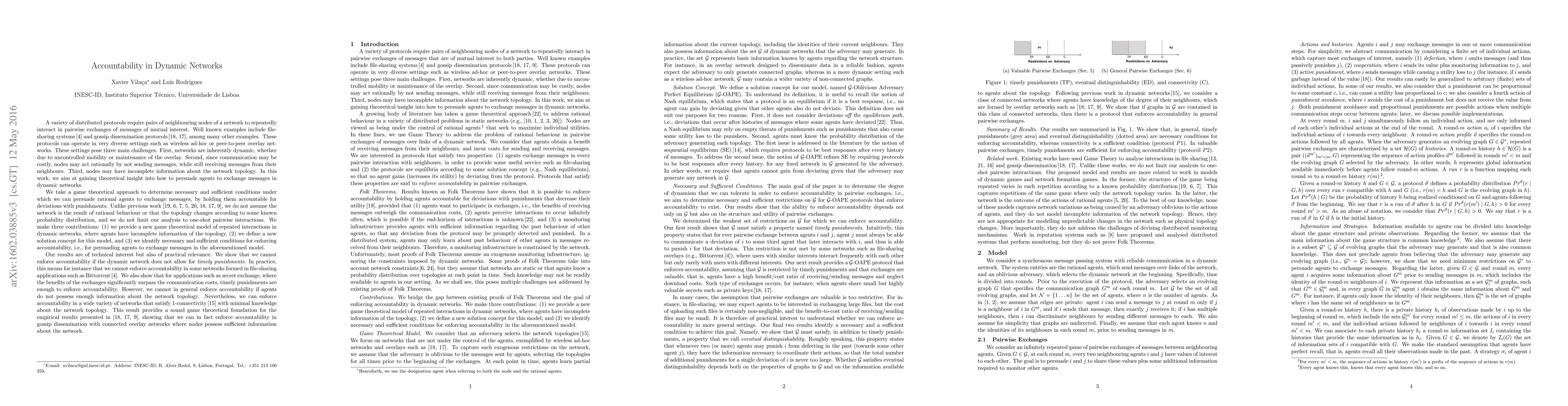 We take a game theoretical approach to determine necessary and sufficient conditions under which we can persuade rational agents to exchange messages in pairwise exchanges over links of a dynamic network, by holding them accountable for deviations with punishments. We make three contributions: (1) we provide a new game theoretical model of repeated interactions in dynamic networks, where agents have incomplete information of the topology, (2) we define a new solution concept for this model, and (3) we identify necessary and sufficient conditions for enforcing accountability, i.e., for persuading agents to exchange messages in the aforementioned model. Our results are of technical interest but also of practical relevance. We show that we cannot enforce accountability if the dynamic network does not allow for \emph{timely punishments}. In practice, this means for instance that we cannot enforce accountability in some networks formed in file-sharing applications such as Bittorrent\,\cite{Cohen:03}. We also show that for applications such as secret exchange, where the benefits of the exchanges significantly surpass the communication costs, timely punishments are enough to enforce accountability. However, we cannot in general enforce accountability if agents do not possess enough information about the network topology. Nevertheless, we can enforce accountability in a wide variety of networks that satisfy 1-connectivity\,\cite{Kuhn:10} with minimal knowledge about the network topology, including overlays for gossip dissemination such as \cite{Li:06,Li:08}.