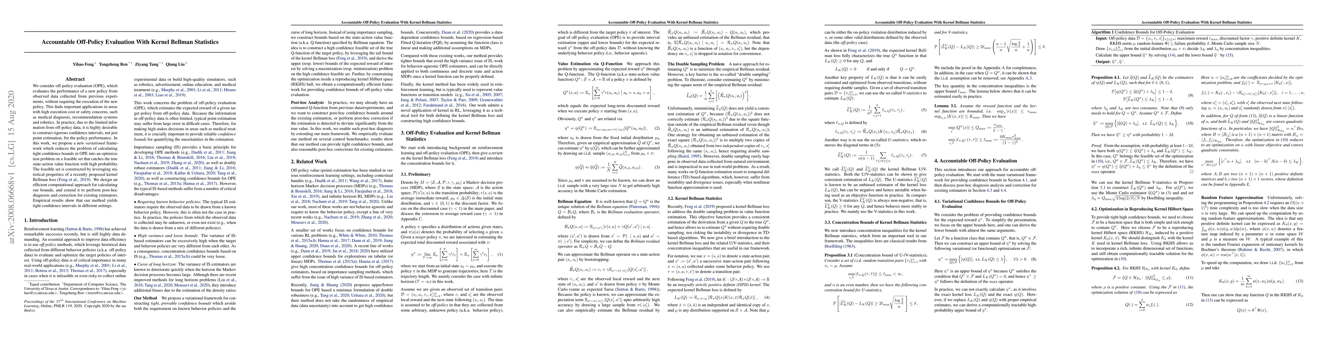 This paper proposes a new variational framework for accountable off-policy evaluation, transforming the problem of calculating confidence bounds into an optimization problem using kernel Bellman statistics. The method efficiently computes tight confidence intervals and extends to correct existing estimators, demonstrating effectiveness in various settings.