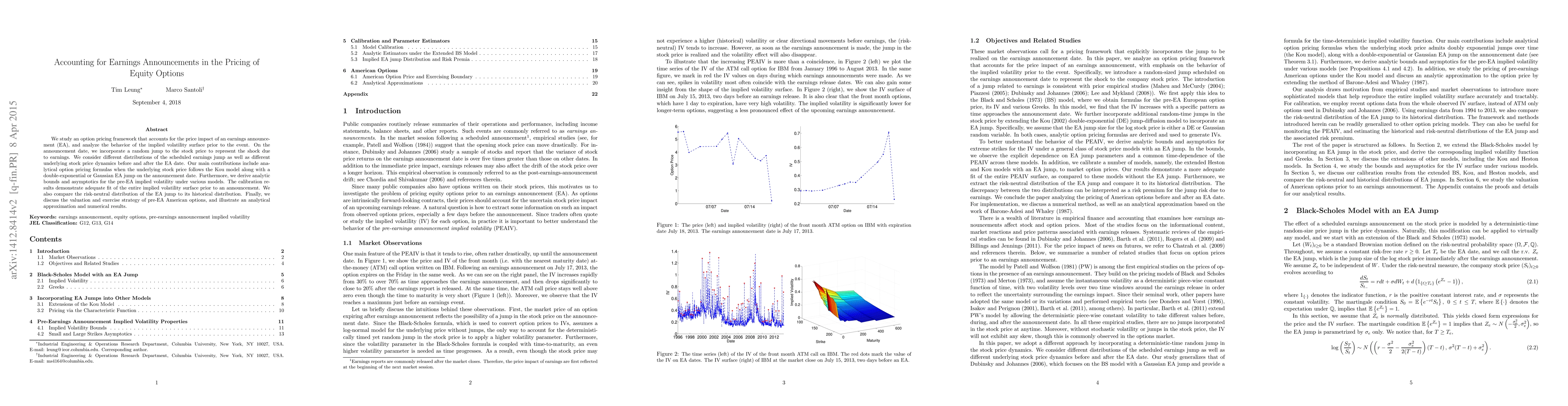 This study develops an option pricing framework that accounts for earnings announcements in the pricing of equity options, including pre-announcement implied volatility analysis and post-announcement stock price jumps.