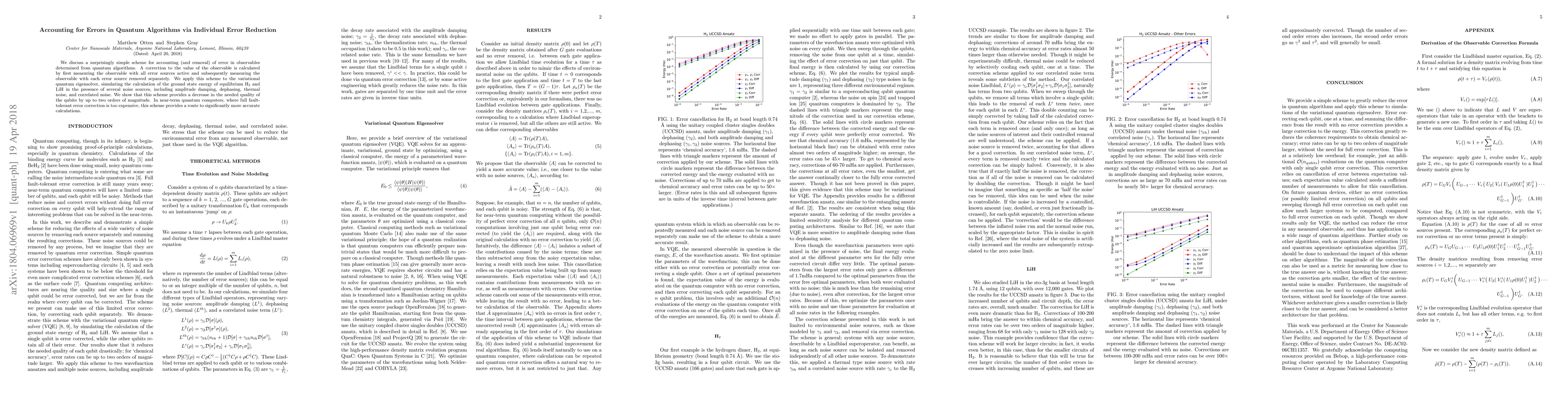 The paper presents a scheme for accounting and removing errors in quantum algorithms by measuring an observable with all error sources active, then separately with each error source removed, and correcting the initial measurement using these individual measurements.