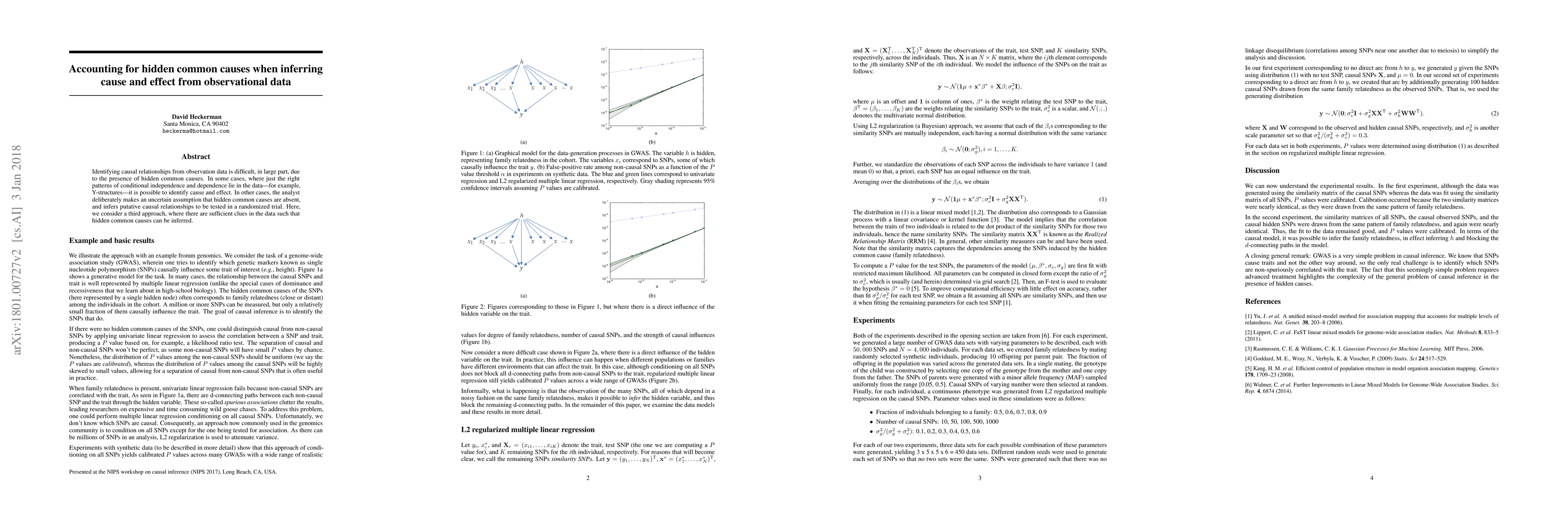 Identifying causal relationships from observation data is difficult, in large part, due to the presence of hidden common causes. In some cases, where just the right patterns of conditional independence and dependence lie in the data---for example, Y-structures---it is possible to identify cause and effect. In other cases, the analyst deliberately makes an uncertain assumption that hidden common causes are absent, and infers putative causal relationships to be tested in a randomized trial. Here, we consider a third approach, where there are sufficient clues in the data such that hidden common causes can be inferred.