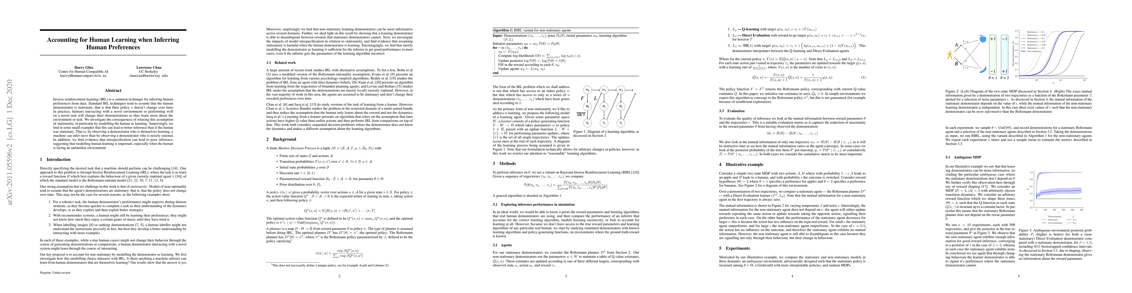 Inverse reinforcement learning (IRL) is a common technique for inferring human preferences from data. Standard IRL techniques tend to assume that the human demonstrator is stationary, that is that their policy $\pi$ doesn't change over time. In practice, humans interacting with a novel environment or performing well on a novel task will change their demonstrations as they learn more about the environment or task. We investigate the consequences of relaxing this assumption of stationarity, in particular by modelling the human as learning. Surprisingly, we find in some small examples that this can lead to better inference than if the human was stationary. That is, by observing a demonstrator who is themselves learning, a machine can infer more than by observing a demonstrator who is noisily rational. In addition, we find evidence that misspecification can lead to poor inference, suggesting that modelling human learning is important, especially when the human is facing an unfamiliar environment.