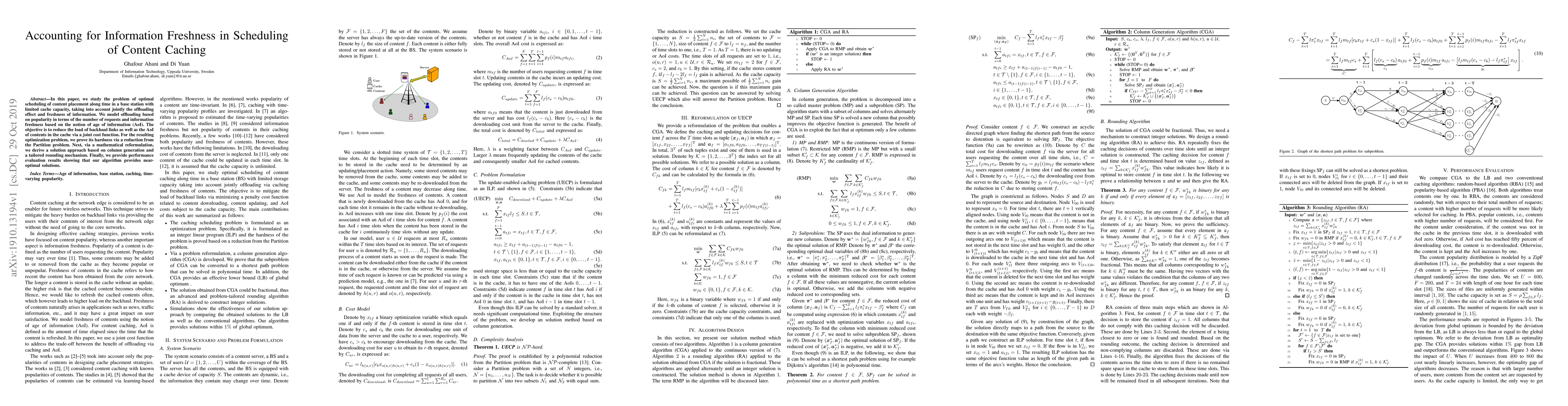 This paper addresses optimal scheduling for content caching in base stations, considering both offloading effects and information freshness, modeled via the age of information (AoI). It proposes a joint cost function to minimize backhaul load and AoI, and presents a solution approach based on column generation and rounding, achieving near-optimal performance.