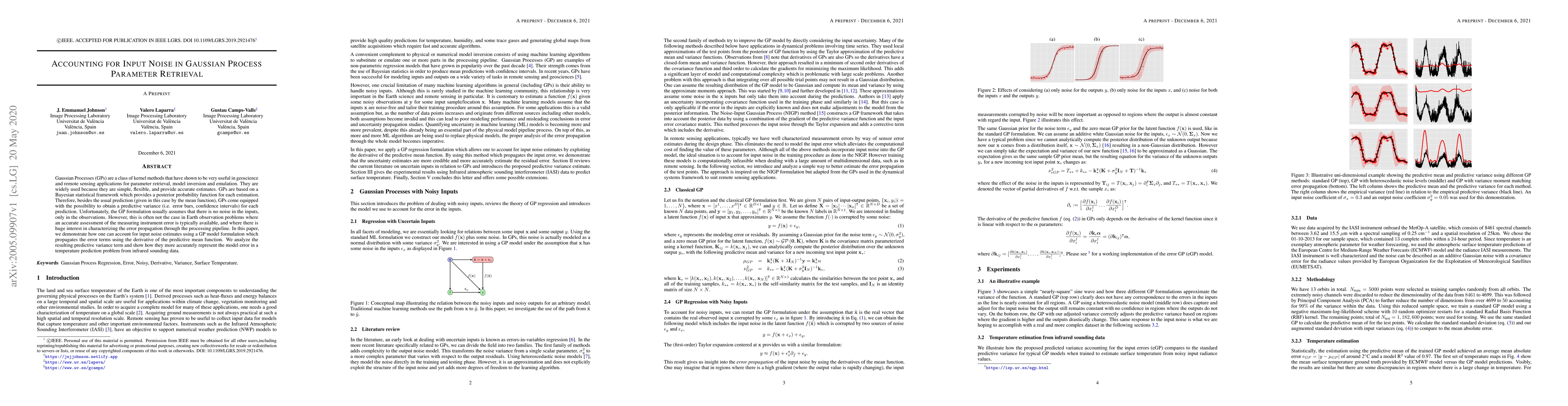 Gaussian processes (GPs) are a class of Kernel methods that have shown to be very useful in geoscience and remote sensing applications for parameter retrieval, model inversion, and emulation. They are widely used because they are simple, flexible, and provide accurate estimates. GPs are based on a Bayesian statistical framework which provides a posterior probability function for each estimation. Therefore, besides the usual prediction (given in this case by the mean function), GPs come equipped with the possibility to obtain a predictive variance (i.e., error bars, confidence intervals) for each prediction. Unfortunately, the GP formulation usually assumes that there is no noise in the inputs, only in the observations. However, this is often not the case in earth observation problems where an accurate assessment of the measuring instrument error is typically available, and where there is huge interest in characterizing the error propagation through the processing pipeline. In this letter, we demonstrate how one can account for input noise estimates using a GP model formulation which propagates the error terms using the derivative of the predictive mean function. We analyze the resulting predictive variance term and show how they more accurately represent the model error in a temperature prediction problem from infrared sounding data.