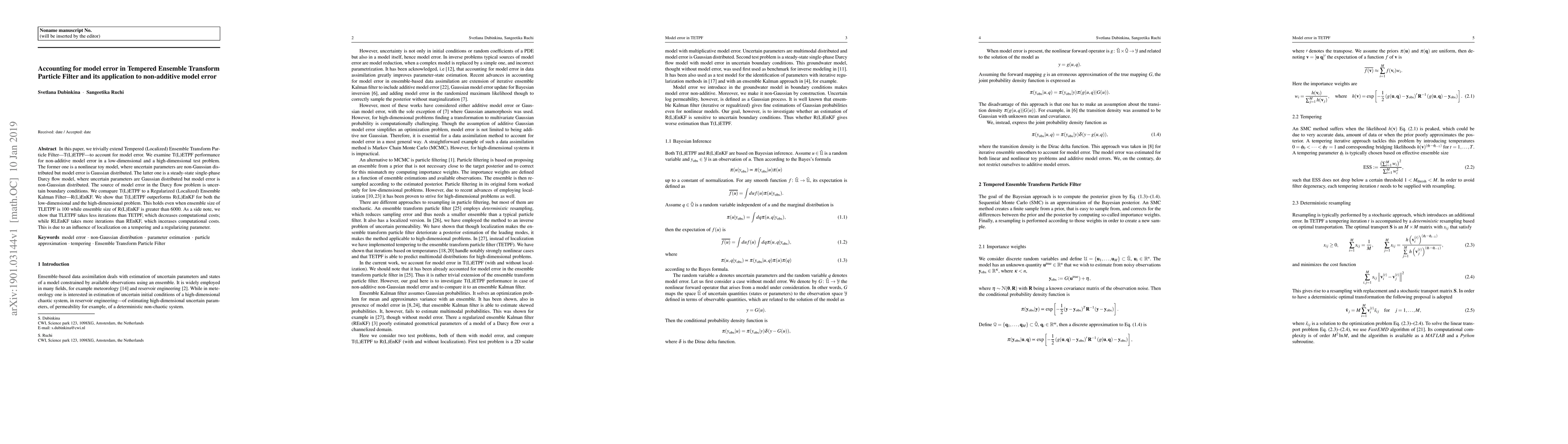 This paper extends the Tempered Ensemble Transform Particle Filter (T(L)ETPF) to account for model error and compares its performance to the Regularized Ensemble Kalman Filter (R(L)EnKF) in both low-dimensional and high-dimensional problems. T(L)ETPF outperforms R(L)EnKF in both scenarios, even with a significantly smaller ensemble size, and requires fewer iterations, thus reducing computational costs.