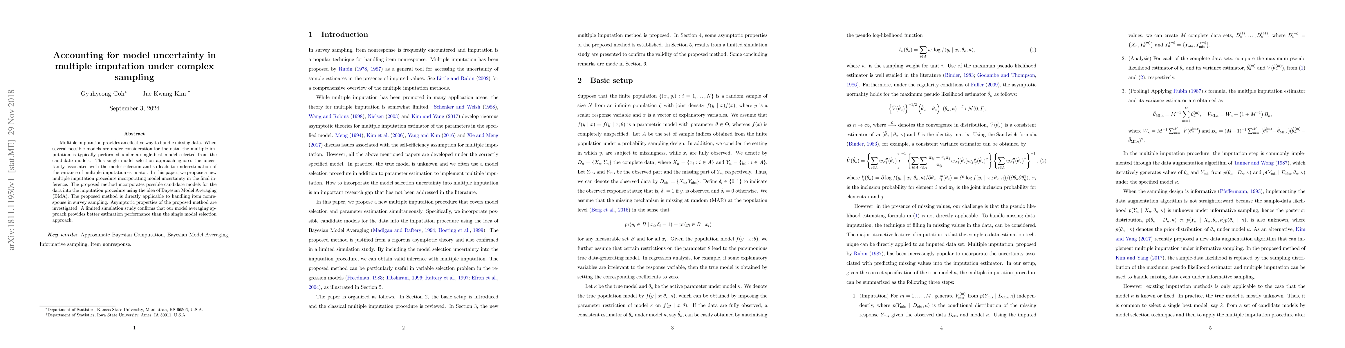 This paper proposes a new multiple imputation method that accounts for model uncertainty by integrating Bayesian Model Averaging, improving variance estimation compared to the single model selection approach. The method is shown to perform better in simulations, especially for handling item nonresponse in complex survey sampling.