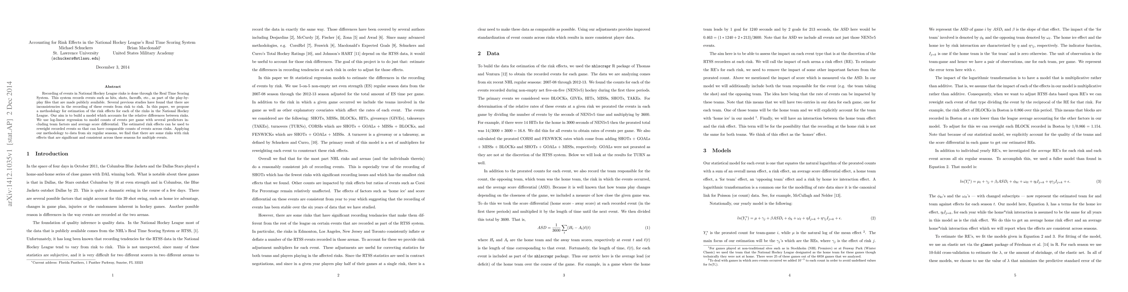 This paper proposes a log-linear regression model to estimate rink effects in NHL's Real Time Scoring System, aiming to account for inconsistencies in event recording across rinks. The results show significant and consistent rink effects for certain rinks across multiple seasons, suggesting the need for reweighting recorded events for comparability.