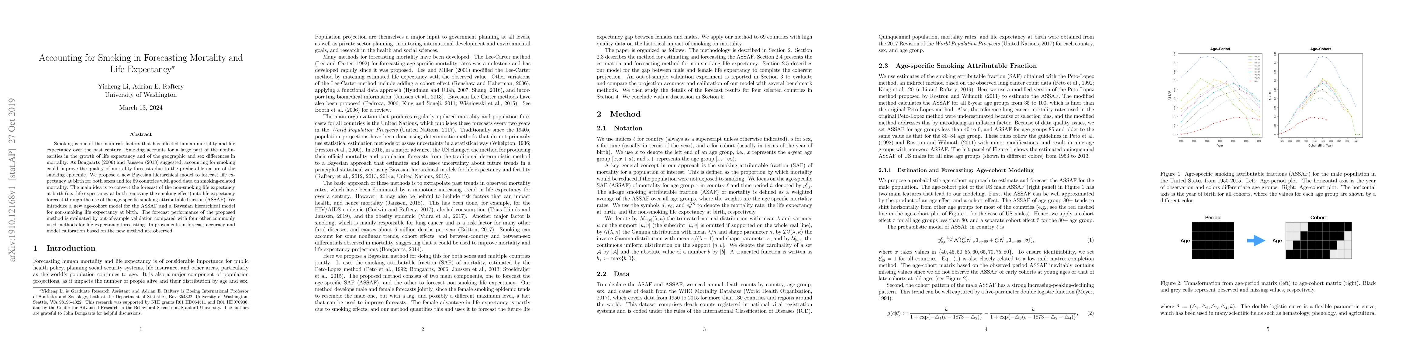 This paper proposes a new Bayesian hierarchical model to improve mortality forecasts by accounting for smoking's impact on life expectancy. The model converts non-smoking life expectancy forecasts into total life expectancy using the age-specific smoking attributable fraction, showing improved forecast accuracy compared to other methods.