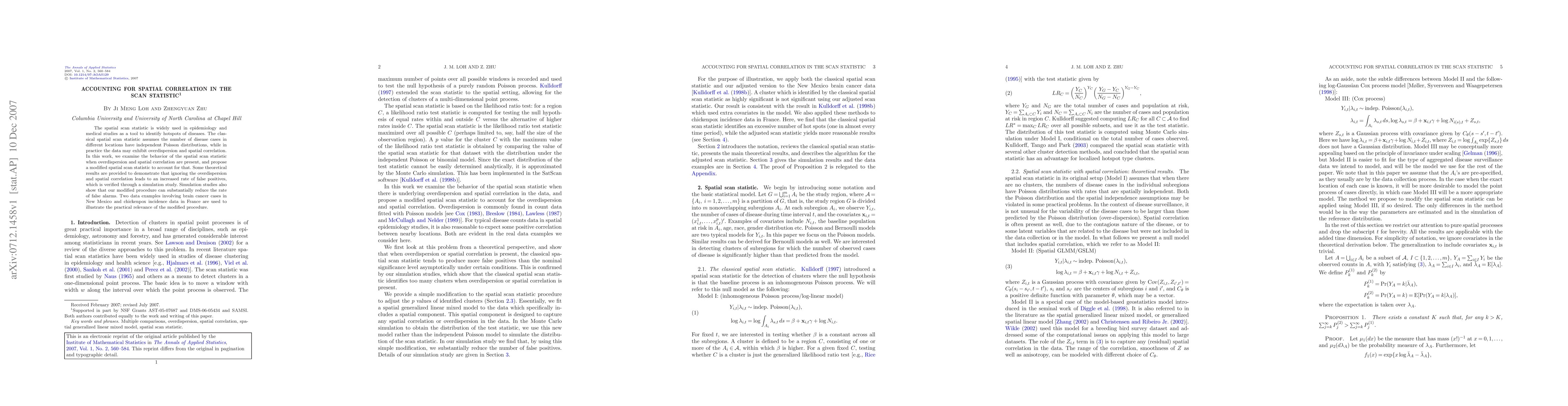 This paper proposes a modified spatial scan statistic to account for overdispersion and spatial correlation in disease data, demonstrating that ignoring these factors increases false positives, while the new method reduces false alarms. Practical relevance is shown through examples involving brain cancer cases and chickenpox incidence data.