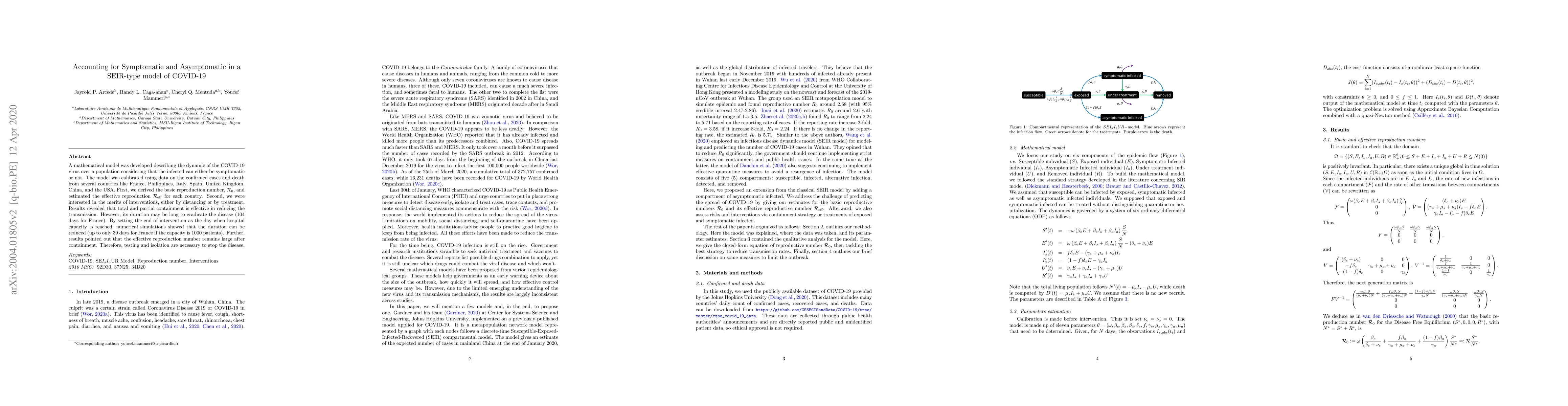 A mathematical model was developed describing the dynamic of the COVID-19 virus over a population considering that the infected can either be symptomatic or not. The model was calibrated using data on the confirmed cases and death from several countries like France, Philippines, Italy, Spain, United Kingdom, China, and the USA. First, we derived the basic reproduction number, $\mathcal{R}_0$, and estimated the effective reproduction $\mathcal{R}_{\rm eff}$ for each country. Second, we were interested in the merits of interventions, either by distancing or by treatment. Results revealed that total and partial containment is effective in reducing the transmission. However, its duration may be long to eradicate the disease (104 days for France). By setting the end of intervention as the day when hospital capacity is reached, numerical simulations showed that the duration can be reduced (up to only 39 days for France if the capacity is 1000 patients). Further, results pointed out that the effective reproduction number remains large after containment. Therefore, testing and isolation are necessary to stop the disease.