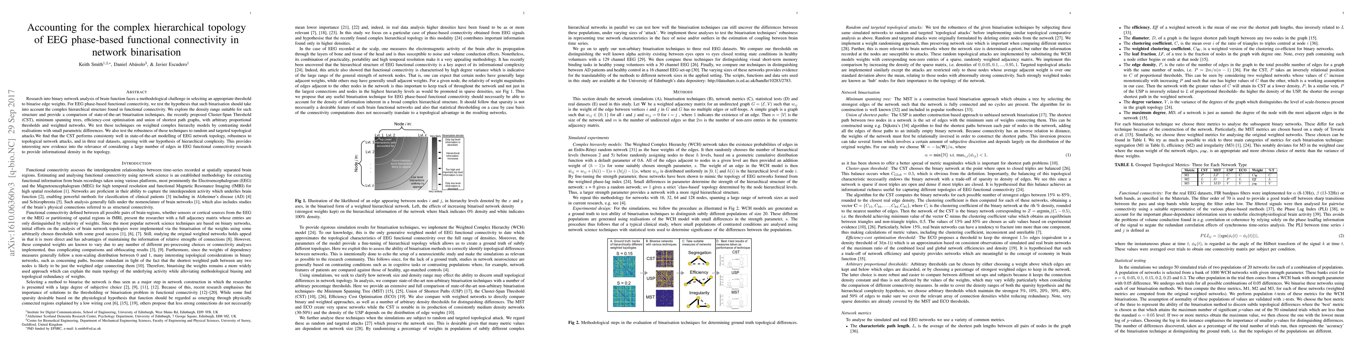 Research into binary network analysis of brain function faces a methodological challenge in selecting an appropriate threshold to binarise edge weights. For EEG phase-based functional connectivity, we test the hypothesis that such binarisation should take into account the complex hierarchical structure found in functional connectivity. We explore the density range suitable for such structure and provide a comparison of state-of-the-art binarisation techniques, the recently proposed Cluster-Span Threshold (CST), minimum spanning trees, efficiency-cost optimisation and union of shortest path graphs, with arbitrary proportional thresholds and weighted networks. We test these techniques on weighted complex hierarchy models by contrasting model realisations with small parametric differences. We also test the robustness of these techniques to random and targeted topological attacks.We find that the CST performs consistenty well in state-of-the-art modelling of EEG network topology, robustness to topological network attacks, and in three real datasets, agreeing with our hypothesis of hierarchical complexity. This provides interesting new evidence into the relevance of considering a large number of edges in EEG functional connectivity research to provide informational density in the topology.