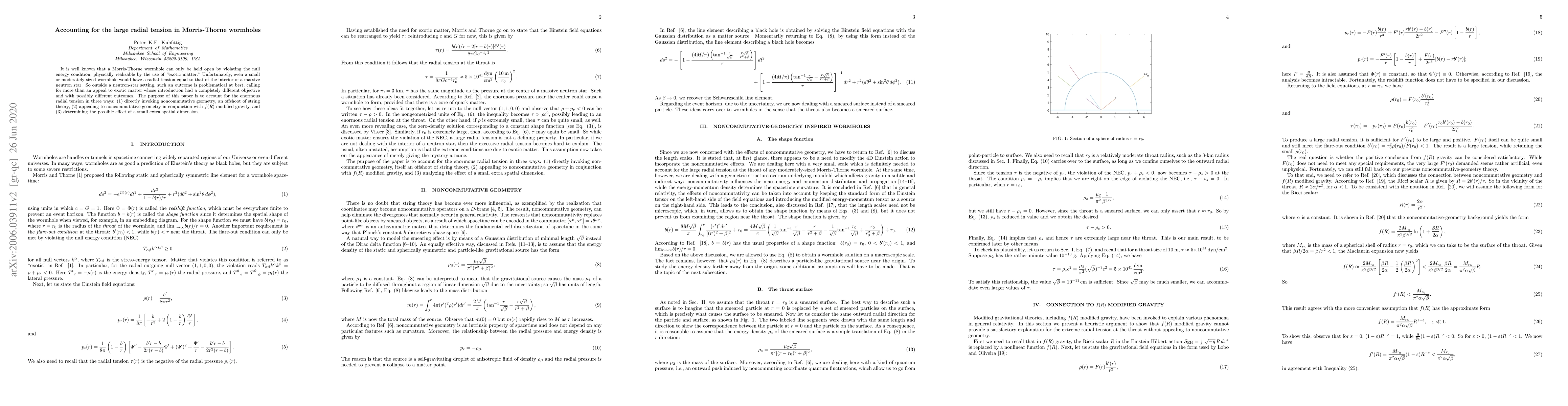 It is well known that a Morris-Thorne wormhole can only be held open by violating the null energy condition, physically realizable by the use of "exotic matter." Unfortunately, even a small or moderately-sized wormhole would have a radial tension equal to that of the interior of a massive neutron star. So outside a neutron-star setting, such an outcome is problematical at best, calling for more than an appeal to exotic matter whose introduction had a completely different objective and with possibly different outcomes. The purpose of this paper is to account for the enormous radial tension in three ways: (1) directly invoking noncommutative geometry, an offshoot of string theory, (2) appealing to noncommutative geometry in conjunction with $f(R)$ modified gravity, and (3) determining the possible effect of a small extra dimension.