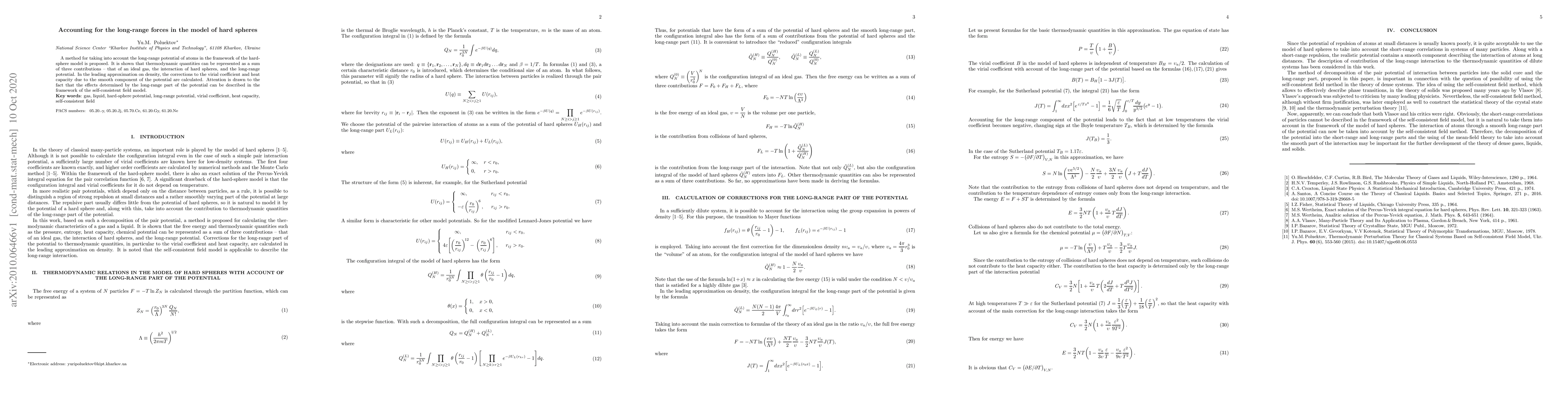 A method for taking into account the long-range potential of atoms in the framework of the hard-sphere model is proposed. It is shown that thermodynamic quantities can be represented as a sum of three contribution: that of an ideal gas, the interaction of hard sphere, and the long-range potential. In the leading approximation on density, the corrections to the virial coefficient and heat capacity due to the smooth component of the potential are calculated. Attention is drawn to the fact that the effects determined by the long-range part of of the potential can be described in the framework of the self-consistent field model.