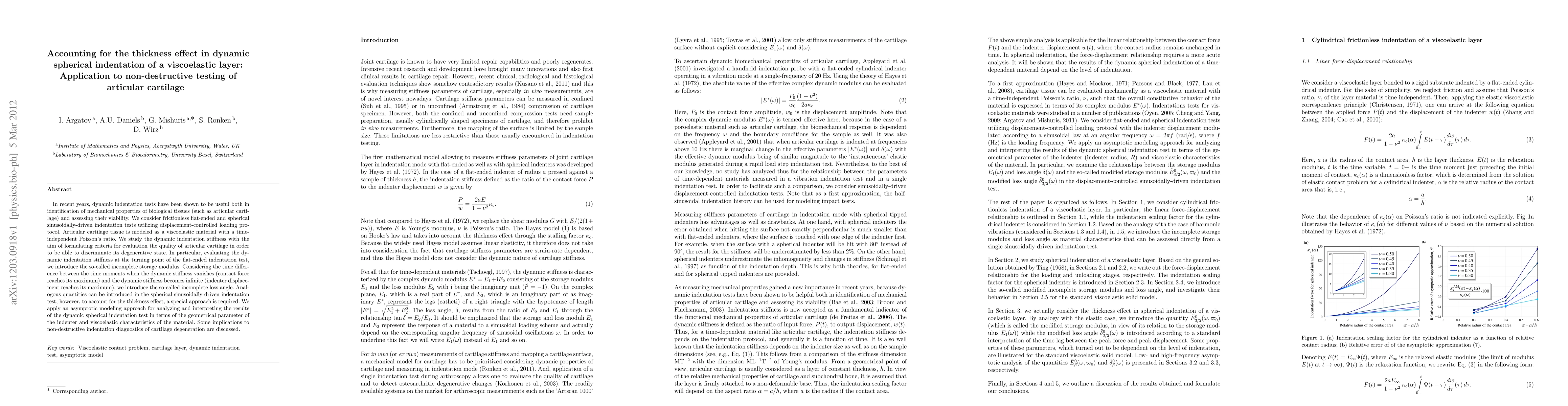 In recent years, dynamic indentation tests have been shown to be useful both in identification of mechanical properties of biological tissues (such as articular cartilage) and assessing their viability. We consider frictionless flat-ended and spherical sinusoidally-driven indentation tests utilizing displacement-controlled loading protocol. Articular cartilage tissue is modeled as a viscoelastic material with a time-independent Poisson's ratio. We study the dynamic indentation stiffness with the aim of formulating criteria for evaluation the quality of articular cartilage in order to be able to discriminate its degenerative state. In particular, evaluating the dynamic indentation stiffness at the turning point of the flat-ended indentation test, we introduce the so-called incomplete storage modulus. Considering the time difference between the time moments when the dynamic stiffness vanishes (contact force reaches its maximum) and the dynamic stiffness becomes infinite (indenter displacement reaches its maximum), we introduce the so-called incomplete loss angle. Analogous quantities can be introduced in the spherical sinusoidally-driven indentation test, however, to account for the thickness effect, a special approach is required. We apply an asymptotic modeling approach for analyzing and interpreting the results of the dynamic spherical indentation test in terms of the geometrical parameter of the indenter and viscoelastic characteristics of the material. Some implications to non-destructive indentation diagnostics of cartilage degeneration are discussed.