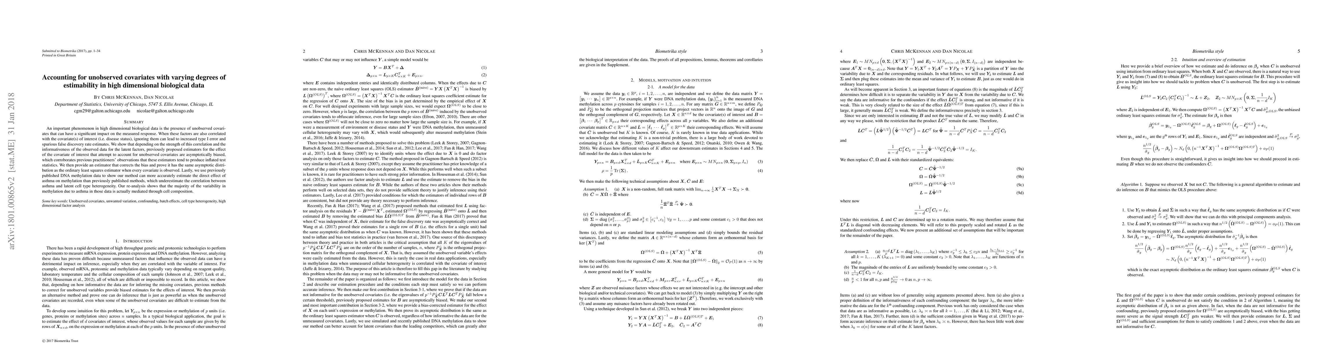 An important phenomenon in high dimensional biological data is the presence of unobserved covariates that can have a significant impact on the measured response. When these factors are also correlated with the covariate(s) of interest (i.e. disease status), ignoring them can lead to increased type I error and spurious false discovery rate estimates. We show that depending on the strength of this correlation and the informativeness of the observed data for the latent factors, previously proposed estimators for the effect of the covariate of interest that attempt to account for unobserved covariates are asymptotically biased, which corroborates previous practitioners' observations that these estimators tend to produce inflated test statistics. We then provide an estimator that corrects the bias and prove it has the same asymptotic distribution as the ordinary least squares estimator when every covariate is observed. Lastly, we use previously published DNA methylation data to show our method can more accurately estimate the direct effect of asthma on methylation than previously published methods, which underestimate the correlation between asthma and latent cell type heterogeneity. Our re-analysis shows that the majority of the variability in methylation due to asthma in those data is actually mediated through cell composition.