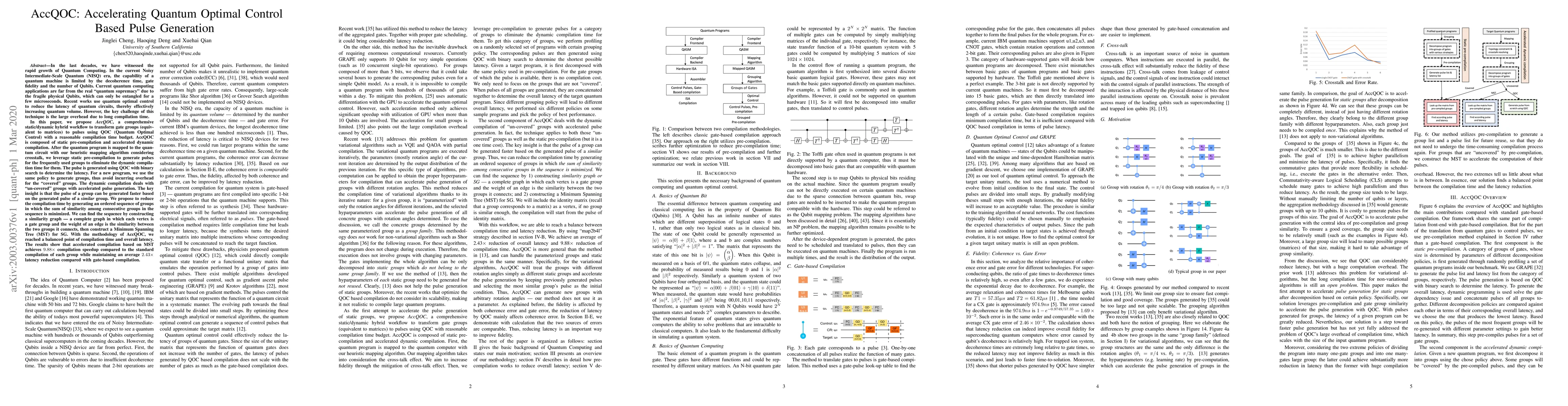 This paper introduces AccQOC, a hybrid static/dynamic compilation method to accelerate quantum optimal control (QOC) for generating pulses in quantum computing, achieving a 9.88x speedup in compilation time while maintaining a 2.43x reduction in overall latency compared to gate-based methods.