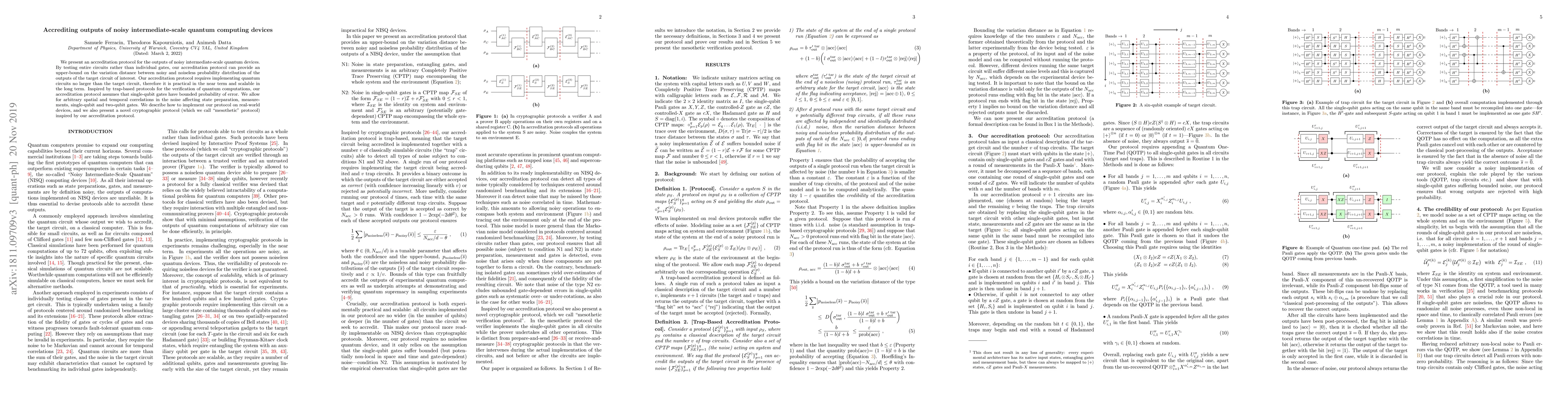 We present an accreditation protocol for the outputs of noisy intermediate-scale quantum devices. By testing entire circuits rather than individual gates, our accreditation protocol can provide an upper-bound on the variation distance between noisy and noiseless probability distribution of the outputs of the target circuit of interest. Our accreditation protocol requires implementation of quantum circuits no larger than the target circuit, therefore it is practical in the near term and scalable in the long term. Inspired by trap-based protocols for the verification of quantum computations, our accreditation protocol assumes that noise in single-qubit gates is bounded (but potentially gate-dependent) in diamond norm. We allow for arbitrary spatial and temporal correlations in the noise affecting state preparation, measurements and two-qubit gates. We describe how to implement our protocol on real-world devices, and we also present a novel cryptographic protocol (which we call `mesothetic' protocol) inspired by our accreditation protocol.