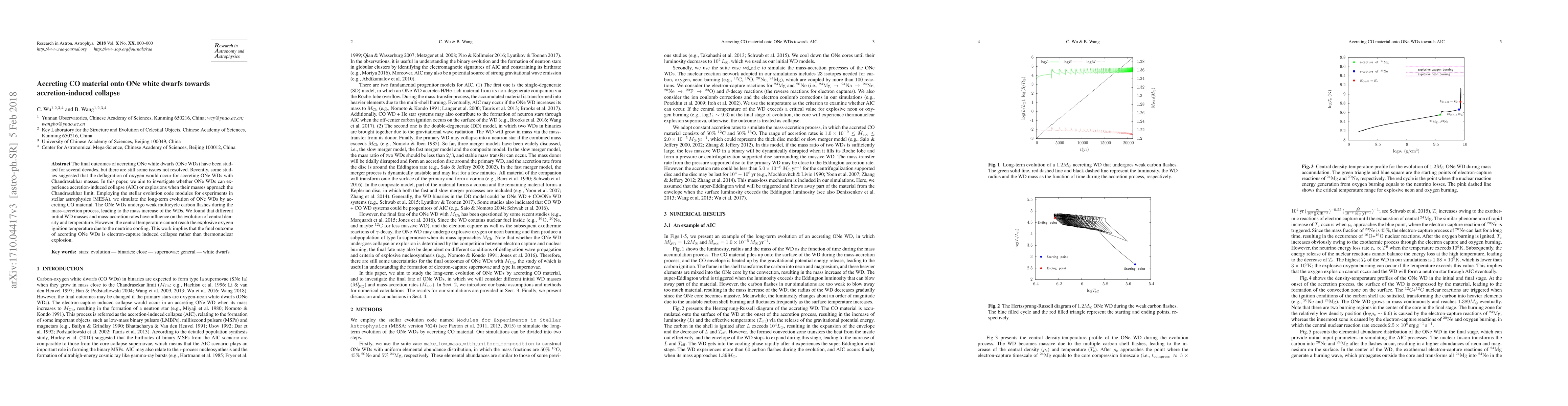 The final outcomes of accreting ONe white dwarfs (ONe WDs) have been studied for several decades, but there are still some issues not resolved. Recently, some studies suggested that the deflagration of oxygen would occur for accreting ONe WDs with Chandrasekhar masses. In this paper, we aim to investigate whether ONe WDs can experience accretion-induced collapse (AIC) or explosions when their masses approach the Chandrasekhar limit. Employing the stellar evolution code modules for experiments in stellar astrophysics (MESA), we simulate the long-term evolution of ONe WDs by accreting CO material. The ONe WDs undergo weak multicycle carbon flashes during the mass-accretion process, leading to the mass increase of the WDs. We found that different initial WD masses and mass-accretion rates have influence on the evolution of central density and temperature. However, the central temperature cannot reach the explosive oxygen ignition temperature due to the neutrino cooling. This work implies that the final outcome of accreting ONe WDs is electron-capture induced collapse rather than thermonuclear explosion.