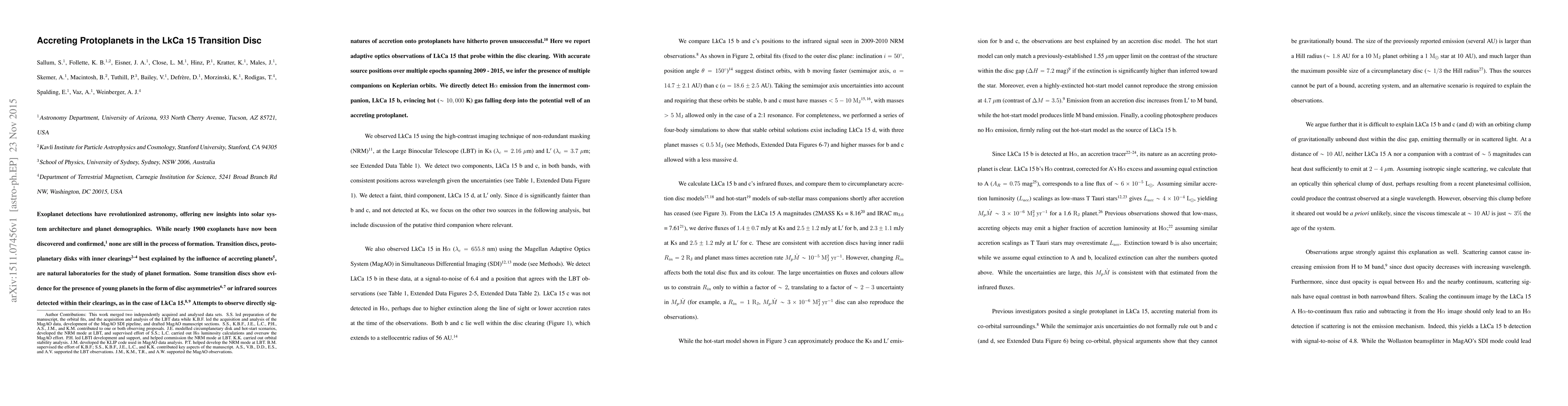 This paper reports adaptive optics observations of the LkCa 15 transition disk, revealing multiple companions on Keplerian orbits and detecting H{\alpha} emission from the innermost companion, LkCa 15 b, indicating accretion onto a protoplanet. These findings provide direct evidence of accreting protoplanets within the disk clearing.