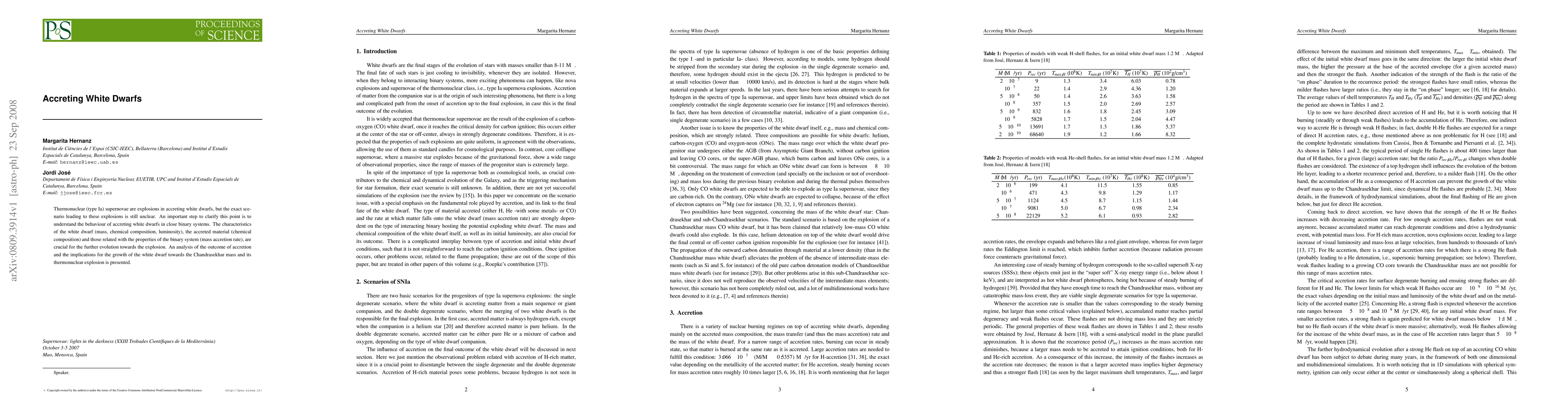 This paper explores the behavior of accreting white dwarfs in binary systems, focusing on the factors influencing their evolution towards thermonuclear supernovae, including mass, chemical composition, and accretion rates. It analyzes the growth of white dwarfs towards the Chandrasekhar limit and the resulting thermonuclear explosions.