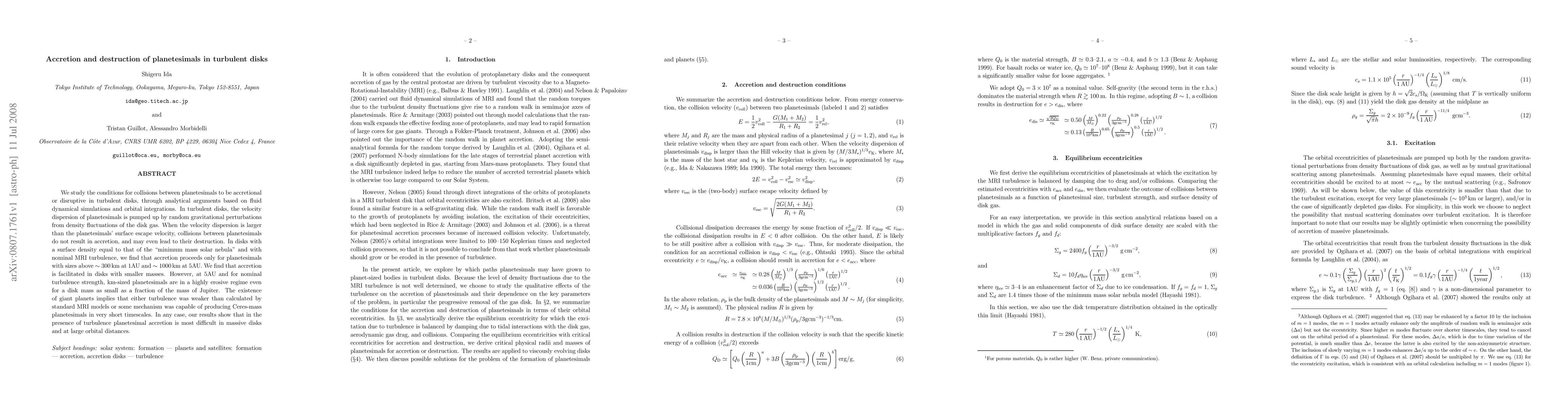 This paper investigates how turbulence in disks affects planetesimal collisions, finding that accretion occurs only for planetesimals larger than 300 km at 1AU and 1000 km at 5AU. It concludes that accretion is hindered in massive disks and at greater distances, suggesting either weaker turbulence or rapid formation mechanisms for large planetesimals.