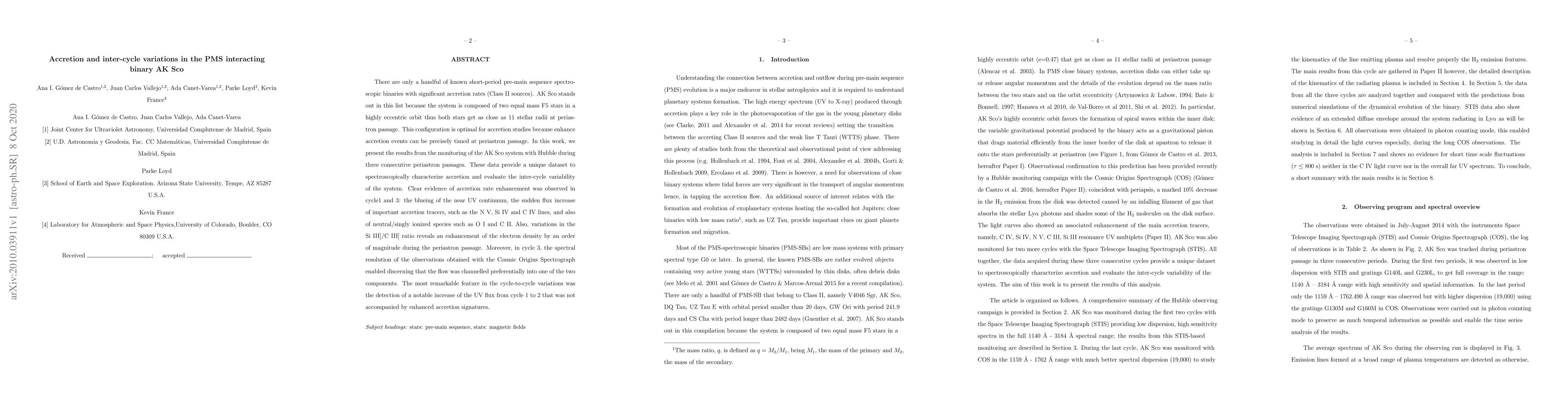 There are only a handful of known short-period pre-main sequence spectroscopic binaries with significant accretion rates (Class II sources). AK Sco stands out in this list because the system is composed of two equal mass F5 stars in a highly eccentric orbit thus both stars get as close as 11 stellar radii at periastron passage. This configuration is optimal for accretion studies because enhance accretion events can be precisely timed at periastron passage. In this work, we present the results from the monitoring of the AK Sco system with Hubble during three consecutive periastron passages. These data provide a unique dataset to spectroscopically characterize accretion and evaluate the inter-cycle variability of the system. Clear evidence of accretion rate enhancement was observed in cycle1 and 3: the blueing of the near UV continuum, the sudden flux increase of important accretion tracers, such as the N V, Si IV and C IV lines, and also of neutral/singly ionized species such as O I and C II. Also, variations in the Si III]/C III] ratio reveals an enhancement of the electron density by an order of magnitude during the periastron passage. Moreover, in cycle 3, the spectral resolution of the observations obtained with the Cosmic Origins Spectrograph enabled discerning that the flow was channelled preferentially into one of the two components. The most remarkable feature in the cycle-to-cycle variations was the detection of a notable increase of the UV flux from cycle 1 to 2 that was not accompanied by enhanced accretion signatures.