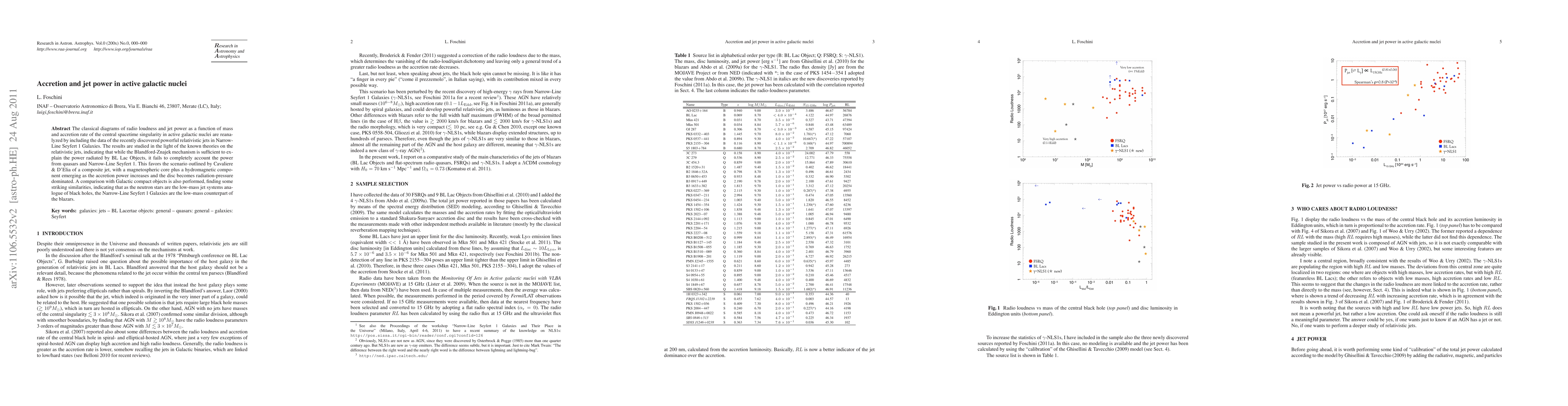The classical diagrams of radio loudness and jet power as a function of mass and accretion rate of the central spacetime singularity in active galactic nuclei are reanalyzed by including the data of the recently discovered powerful relativistic jets in Narrow-Line Seyfert 1 Galaxies. The results are studied in the light of the known theories on the relativistic jets, indicating that while the Blandford-Znajek mechanism is sufficient to explain the power radiated by BL Lac Objects, it fails to completely account the power from quasars and Narrow-Line Seyfert 1. This favors the scenario outlined by Cavaliere & D'Elia of a composite jet, with a magnetospheric core plus a hydromagnetic component emerging as the accretion power increases and the disc becomes radiation-pressure dominated. A comparison with Galactic compact objects is also performed, finding some striking similarities, indicating that as the neutron stars are the low-mass jet systems analogue of black holes, the Narrow-Line Seyfert 1 Galaxies are the low-mass counterpart of the blazars.