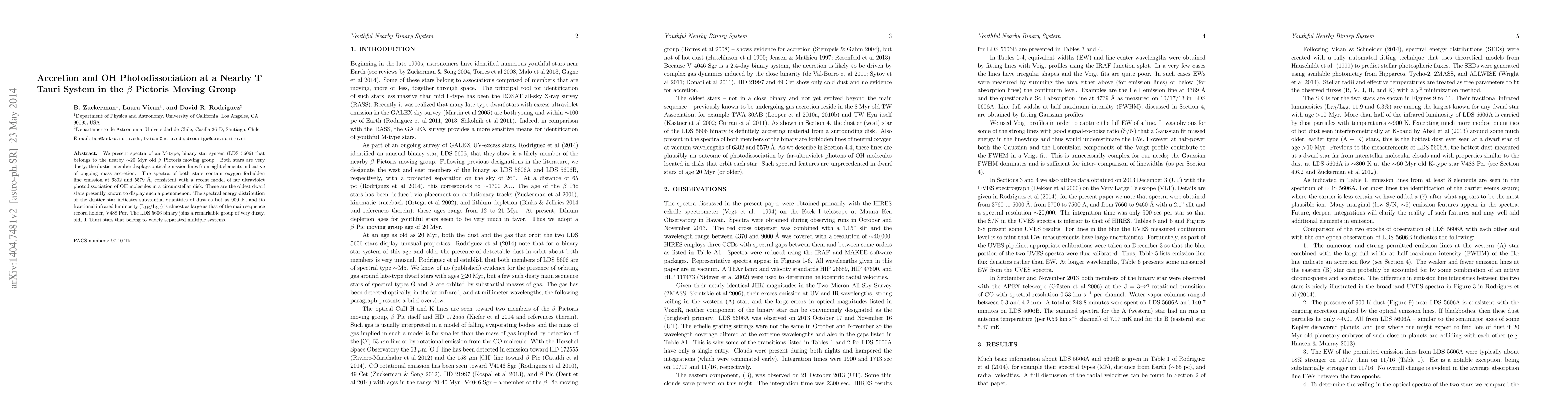 We present spectra of an M-type, binary star system (LDS 5606) that belongs to the nearby ~20 Myr old beta Pictoris moving group. Both stars are very dusty; the dustier member displays optical emission lines from eight elements indicative of ongoing mass accretion. The spectra of both stars contain oxygen forbidden line emission at 6302 and 5579 A, consistent with a recent model of far ultraviolet photodissociation of OH molecules in a circumstellar disk. These are the oldest dwarf stars presently known to display such a phenomenon. The spectral energy distribution of the dustier star indicates substantial quantities of dust as hot as 900 K, and its fractional infrared luminosity (L_IR)/L_bol) is almost as large as that of the main sequence record holder, V488 Per. The LDS 5606 binary joins a remarkable group of very dusty, old, T Tauri stars that belong to widely separated multiple systems.