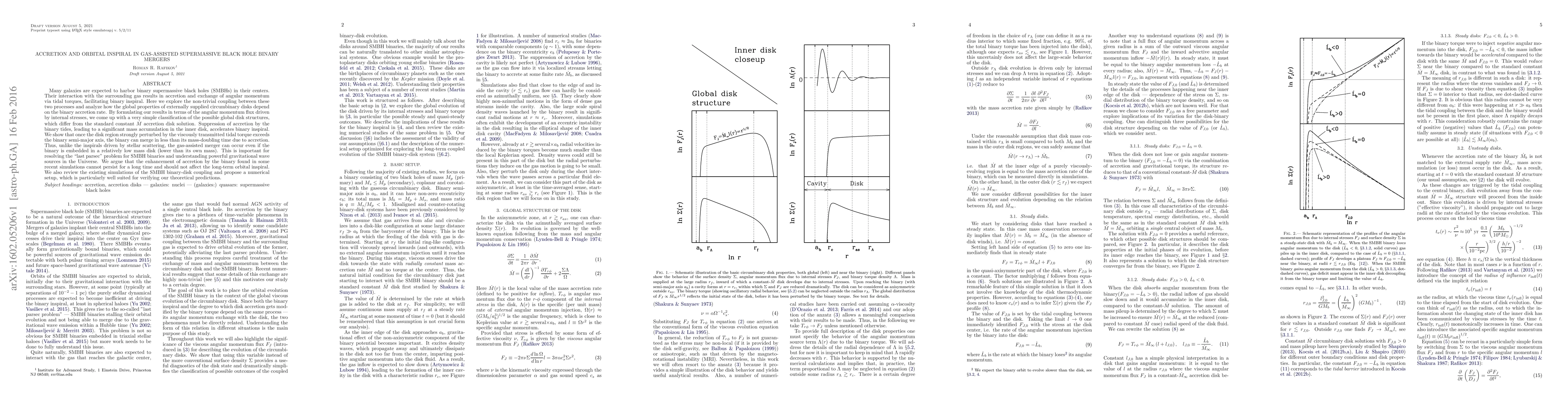 Many galaxies are expected to harbor binary supermassive black holes (SMBHs) in their centers. Their interaction with the surrounding gas results in accretion and exchange of angular momentum via tidal torques, facilitating binary inspiral. Here we explore the non-trivial coupling between these two processes and analyze how the global properties of externally supplied circumbinary disks depend on the binary accretion rate. By formulating our results in terms of the angular momentum flux driven by internal stresses, we come up with a very simple classification of the possible global disk structures, which differ from the standard constant $\dot M$ accretion disk solution. Suppression of accretion by the binary tides, leading to a significant mass accumulation in the inner disk, accelerates binary inspiral. We show that once the disk region strongly perturbed by the viscously transmitted tidal torque exceeds the binary semi-major axis, the binary can merge in less than its mass-doubling time due to accretion. Thus, unlike the inspirals driven by stellar scattering, the gas-assisted merger can occur even if the binary is embedded in a relatively low mass disk (lower than its own mass). This is important for resolving the "last parsec" problem for SMBH binaries and understanding powerful gravitational wave sources in the Universe. We argue that the enhancement of accretion by the binary found in some recent simulations cannot persist for a long time and should not affect the long-term orbital inspiral. We also review the existing simulations of the SMBH binary-disk coupling and propose a numerical setup, which is particularly well suited for verifying our theoretical predictions.