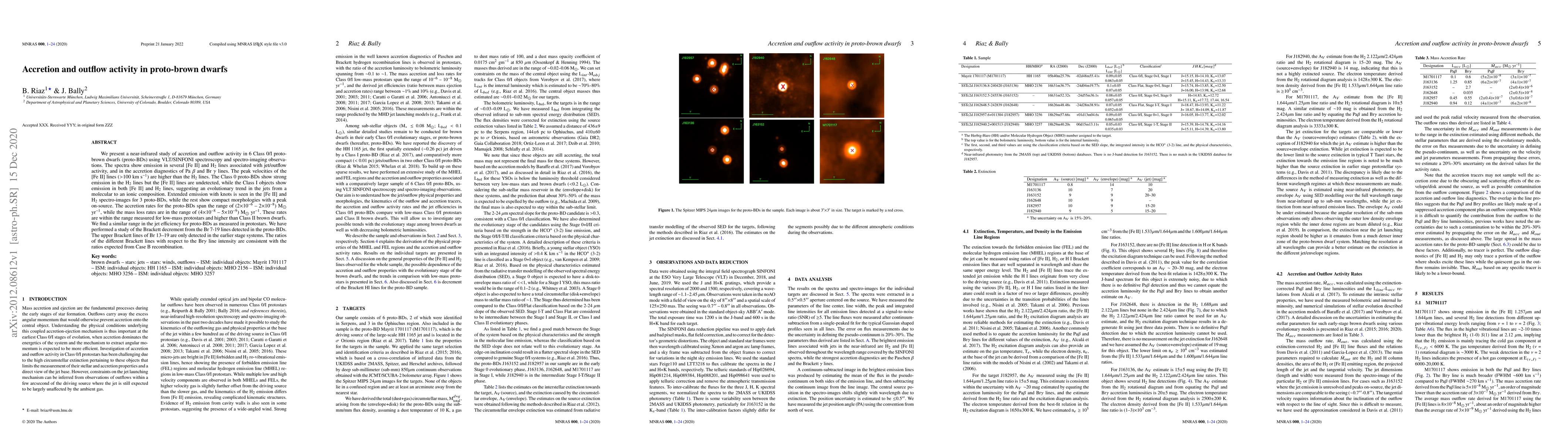 This study investigates accretion and outflow activity in 6 proto-brown dwarfs using VLT/SINFONI spectroscopy, revealing jet/outflow emissions in [FeII] and H$_{2}$ lines, with higher peak velocities in [FeII]. Class 0 proto-BDs show strong H$_{2}$ but no [FeII] emission, while Class I objects exhibit both, indicating an evolutionary trend in jet composition.
