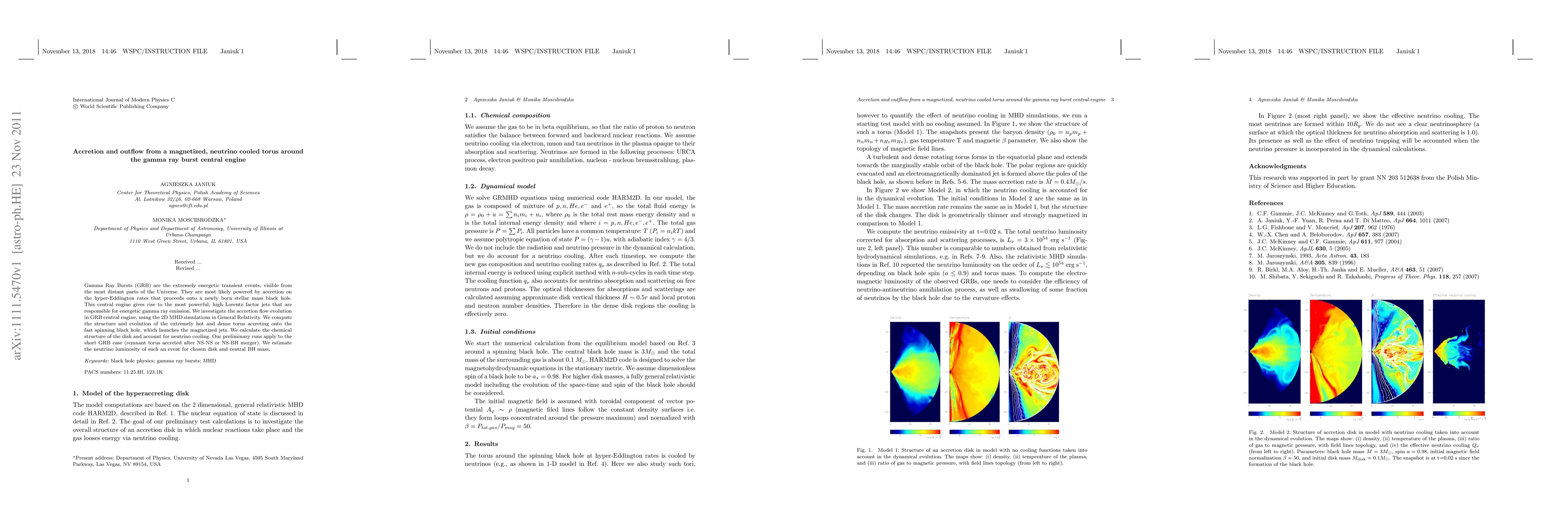 Gamma Ray Bursts (GRB) are the extremely energetic transient events, visible from the most distant parts of the Universe. They are most likely powered by accretion on the hyper-Eddington rates that proceeds onto a newly born stellar mass black hole. This central engine gives rise to the most powerful, high Lorentz factor jets that are responsible for energetic gamma ray emission. We investigate the accretion flow evolution in GRB central engine, using the 2D MHD simulations in General Relativity. We compute the structure and evolution of the extremely hot and dense torus accreting onto the fast spinning black hole, which launches the magnetized jets. We calculate the chemical structure of the disk and account for neutrino cooling. Our preliminary runs apply to the short GRB case (remnant torus accreted after NS-NS or NS-BH merger). We estimate the neutrino luminosity of such an event for chosen disk and central BH mass