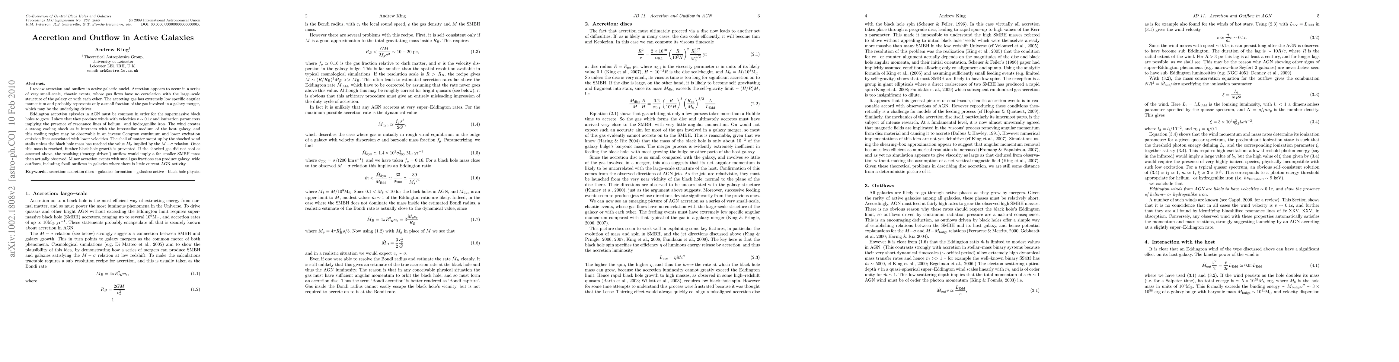 I review accretion and outflow in active galactic nuclei. Accretion appears to occur in a series of very small--scale, chaotic events, whose gas flows have no correlation with the large--scale structure of the galaxy or with each other. The accreting gas has extremely low specific angular momentum and probably represents only a small fraction of the gas involved in a galaxy merger, which may be the underlying driver. Eddington accretion episodes in AGN must be common in order for the supermassive black holes to grow. I show that they produce winds with velocities $v \sim 0.1c$ and ionization parameters implying the presence of resonance lines of helium-- and hydrogenlike iron. The wind creates a strong cooling shock as it interacts with the interstellar medium of the host galaxy, and this cooling region may be observable in an inverse Compton continuum and lower--excitation emission lines associated with lower velocities. The shell of matter swept up by the shocked wind stalls unless the black hole mass has reached the value $M_{\sigma}$ implied by the $M - \sigma$ relation. Once this mass is reached, further black hole growth is prevented. If the shocked gas did not cool as asserted above, the resulting (`energy-driven') outflow would imply a far smaller SMBH mass than actually observed. Minor accretion events with small gas fractions can produce galaxy-wide outflows, including fossil outflows in galaxies where there is little current AGN activity.