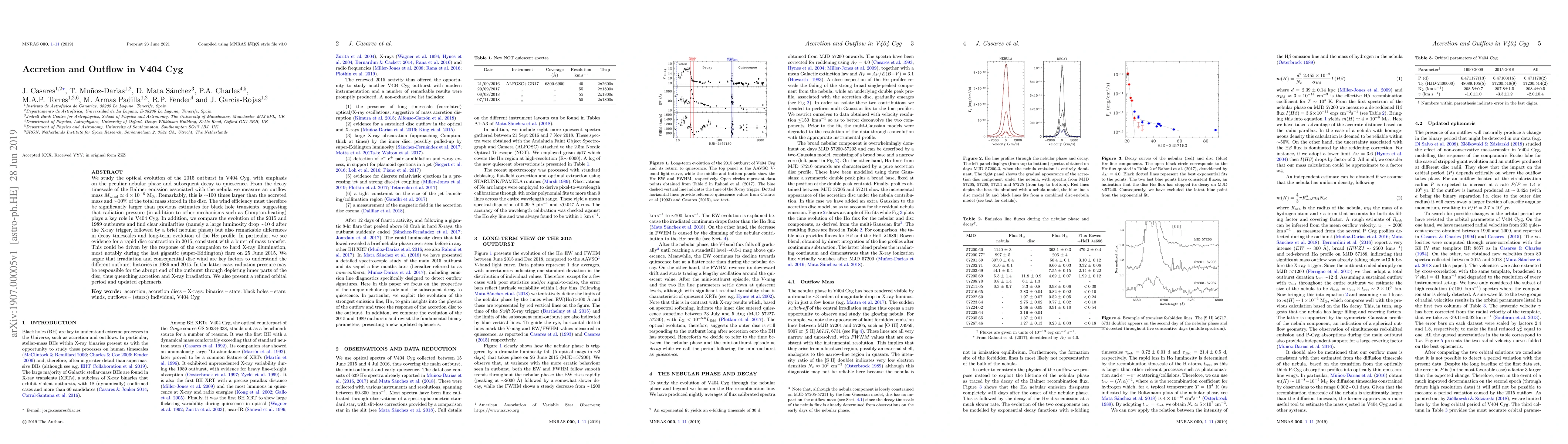We study the optical evolution of the 2015 outburst in V404 Cyg, with emphasis on the peculiar nebular phase and subsequent decay to quiescence. From the decay timescale of the Balmer emission associated with the nebula we measure an outflow mass M_wind~4x10^{-6} Msun. Remarkably, this is ~100 times larger than the accreted mass and ~10% of the total mass stored in the disc. The wind efficiency must therefore be significantly larger than previous estimates for black hole transients, suggesting that radiation pressure (in addition to other mechanisms such as Compton-heating) plays a key role in V404 Cyg. In addition, we compare the evolution of the 2015 and 1989 outbursts and find clear similarities (namely a large luminosity drop ~10 d after the X-ray trigger, followed by a brief nebular phase) but also remarkable differences in decay timescales and long-term evolution of the Halpha profile. In particular, we see evidence for a rapid disc contraction in 2015, consistent with a burst of mass transfer. This could be driven by the response of the companion to hard X-ray illumination, most notably during the last gigantic (super-Eddington) flare on 25 June 2015. We argue that irradiation and consequential disc wind are key factors to understand the different outburst histories in 1989 and 2015. In the latter case, radiation pressure may be responsible for the abrupt end of the outburst through depleting inner parts of the disc, thus quenching accretion and X-ray irradiation. We also present a refined orbital period and updated ephemeris.