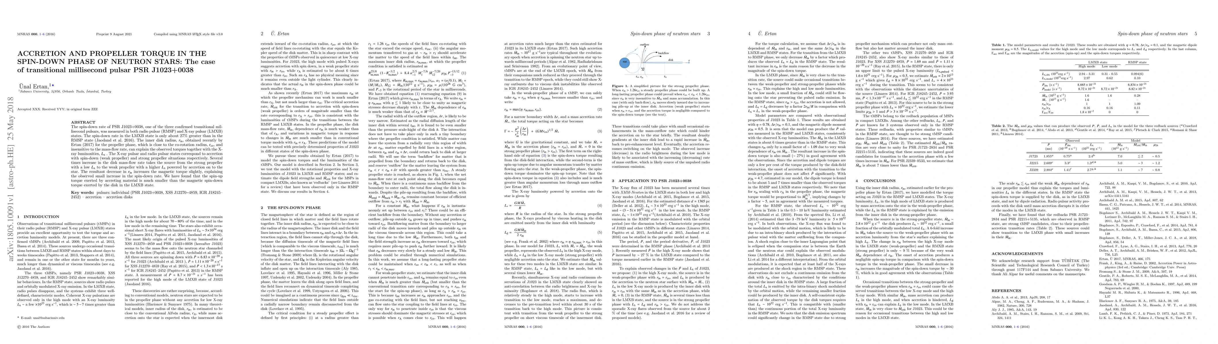 The spin-down rate of PSR J1023+0038, one of the three confirmed transitional millisecond pulsars, was measured in both radio pulsar (RMSP) and X-ray pulsar (LMXB) states. The spin-down rate in the LMXB state is only about 27 % greater than in the RMSP state (Jaodand et al. 2016). The inner disk radius, r_in, obtained recently by Ertan (2017) for the propeller phase, which is close to the co-rotation radius, r_co, and insensitive to the mass-flow rate, can explain the observed torques together with the X-ray luminosities, Lx . The X-ray pulsar and radio pulsar states correspond to accretion with spin-down (weak propeller) and strong propeller situations respectively. Several times increase in the disk mass-flow rate takes the source from the strong propeller with a low Lx to the weak propeller with a higher Lx powered by accretion on to the star. The resultant decrease in r_in increases the magnetic torque slightly, explaining the observed small increase in the spin-down rate. We have found that the spin-up torque exerted by accreting material is much smaller than the magnetic spin-down torque exerted by the disk in the LMXB state.