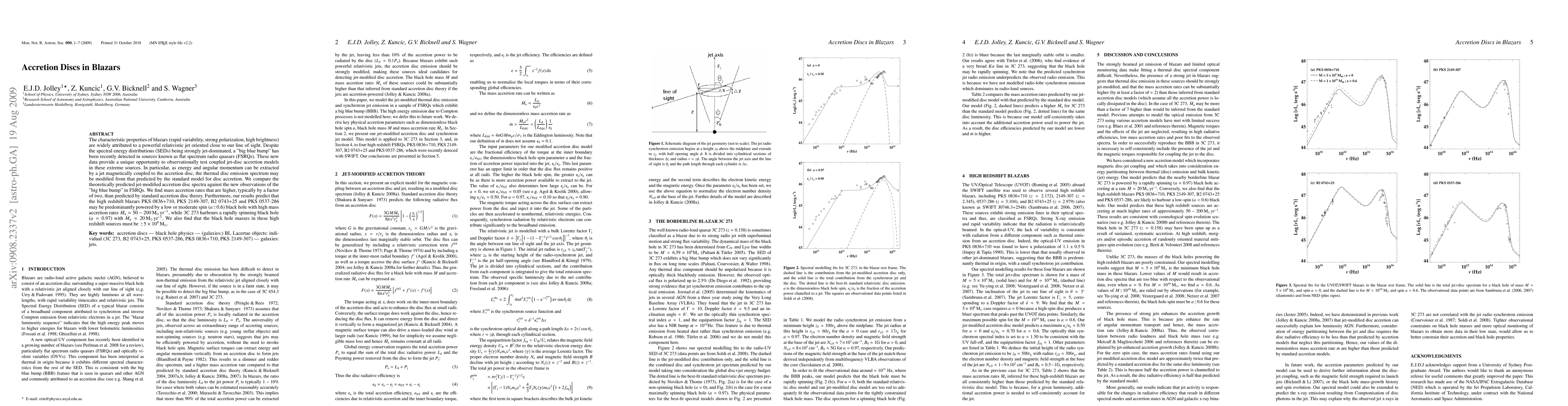 The characteristic properties of blazars (rapid variability, strong polarization, high brightness) are widely attributed to a powerful relativistic jet oriented close to our line of sight. Despite the spectral energy distributions (SEDs) being strongly jet-dominated, a "big blue bump" has been recently detected in sources known as flat spectrum radio quasars (FSRQs). These new data provide a unique opportunity to observationally test coupled jet-disc accretion models in these extreme sources. In particular, as energy and angular momentum can be extracted by a jet magnetically coupled to the accretion disc, the thermal disc emission spectrum may be modified from that predicted by the standard model for disc accretion. We compare the theoretically predicted jet-modified accretion disc spectra against the new observations of the "big blue bump" in FSRQs. We find mass accretion rates that are higher, typically by a factor of two, than predicted by standard accretion disc theory. Furthermore, our results predict that the high redshift blazars PKS 0836+710, PKS 2149-307, B2 0743+25 and PKS 0537-286 may be predominantly powered by a low or moderate spin (a < 0.6) black hole with high mass accretion rates mdot_a ~ 50 - 200 msol/yr, while 3C 273 harbours a rapidly spinning black hole (a = 0.97) with mdot_a ~ 20 msol/yr. We also find that the black hole masses in these high redshift sources must be > 5 * 10^9 msol.